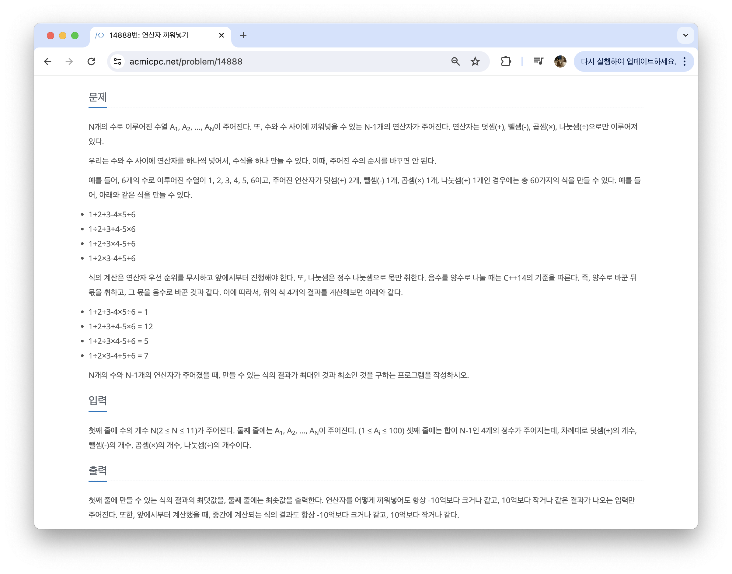 숫자의 배열과 연산기호의 배열을 주면 이를 통해 가장 큰 값, 작은 값을 찾는 문제이다.