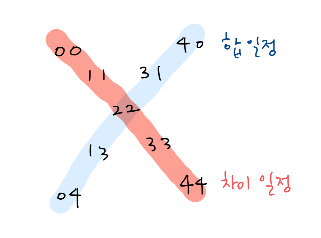 대각선의 경우 합과 차이가 일정하게 된다. 따라서 합과 차이를 통해 대각선을 판별하게 하였다. 차이의 경우 마이너스가 될 수 있으므로 n을 더해서 0 이상의 수로 유지했다.