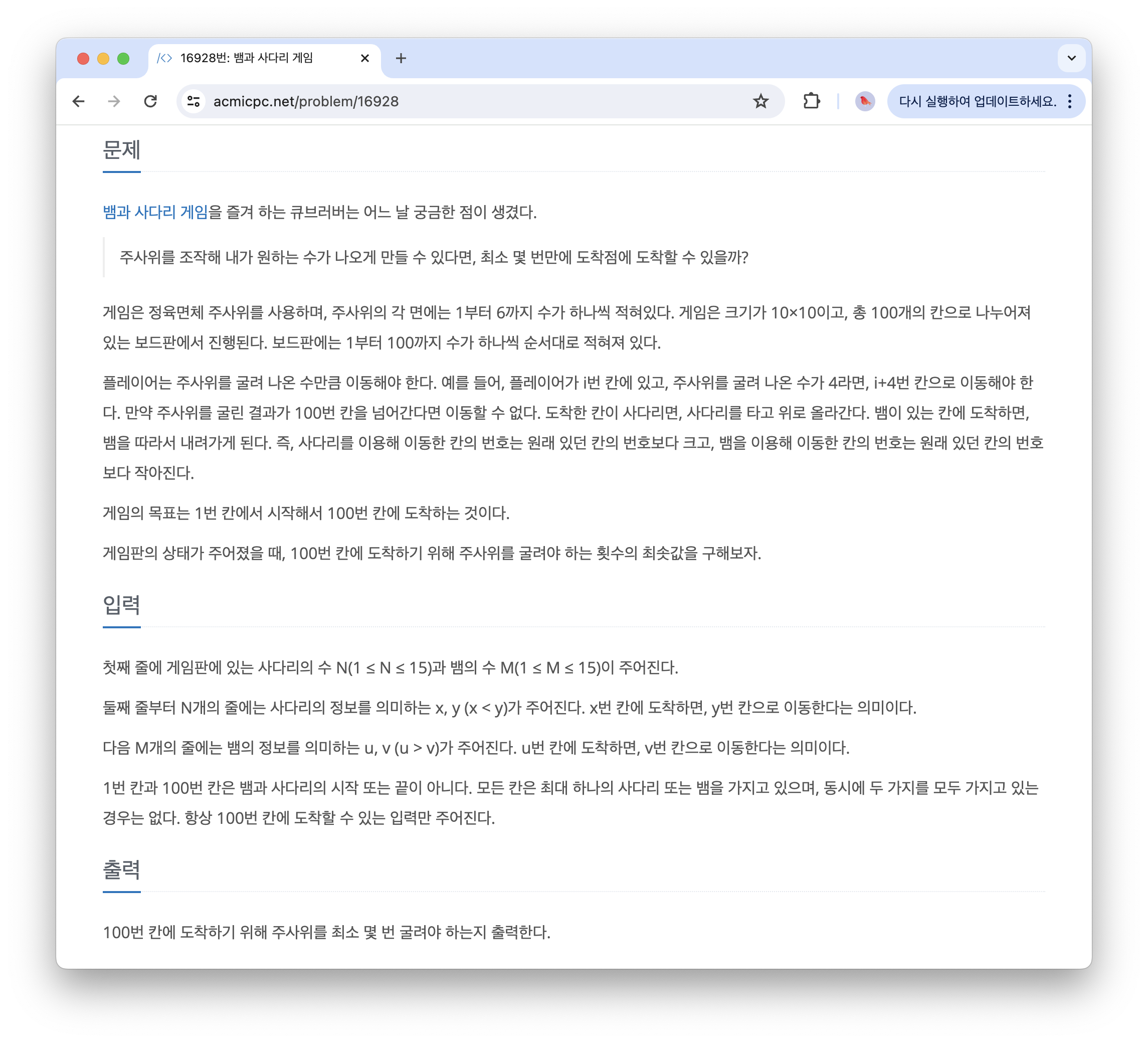 board, visited 를 통해 보드의 정보, 방문여부를 저장하여 구현했다. 처음에 틀렸는데 이유는 뱀을 타고 내려가는 경우는 일부로 고려하지 않았는데, 뱀을 타고 내려가는 경우에도 빨리 도착하는 경우가 있다.