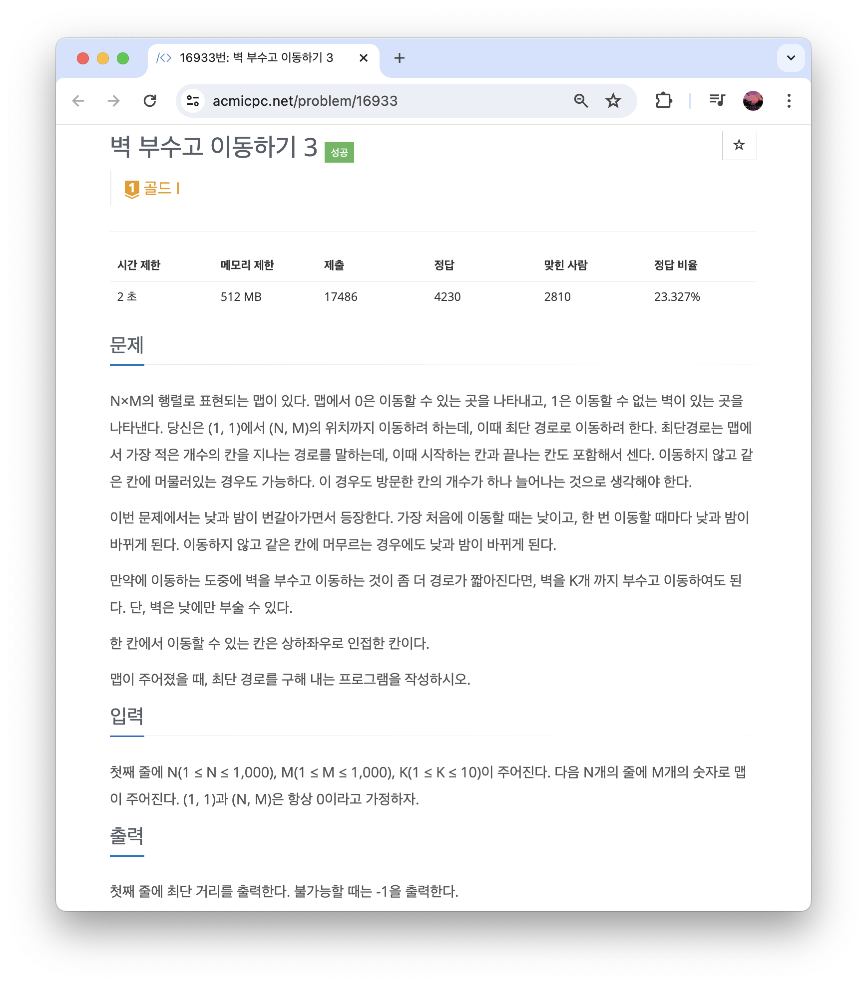 벽 부수기 시리즈! 이번에는 낮에만 블록을 깰 수 있다는 제약조건이 있다.