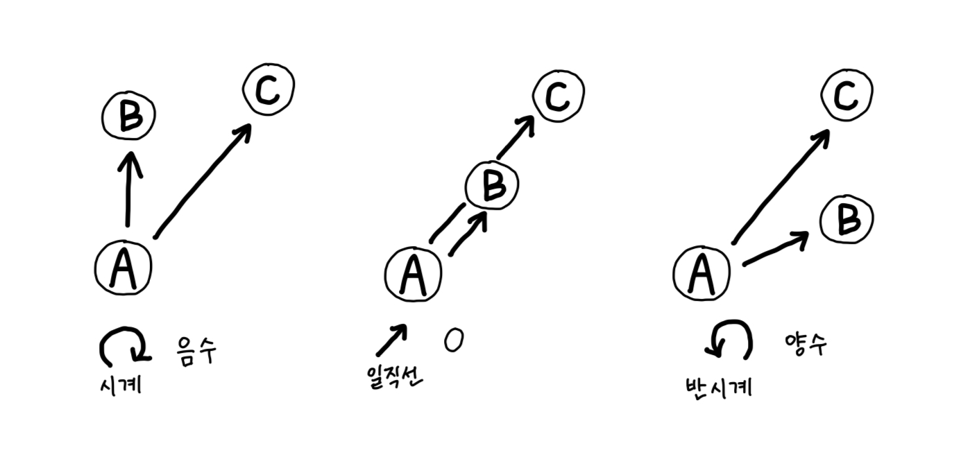 이 문제는 CCW(Count Clockwise) 알고리즘을 사용했다. 단순히 정답만 궁금하다면 아래 정답코드를 참고하면 된다. 기하학이 나와서 문제가 골드인데 사실 공식만 안다면 단순한 구현문제이다. 솔직히 벡터의 외적을 사용하지 않고 이 문제를 쉽게 푸는 방법을 모르겠다...