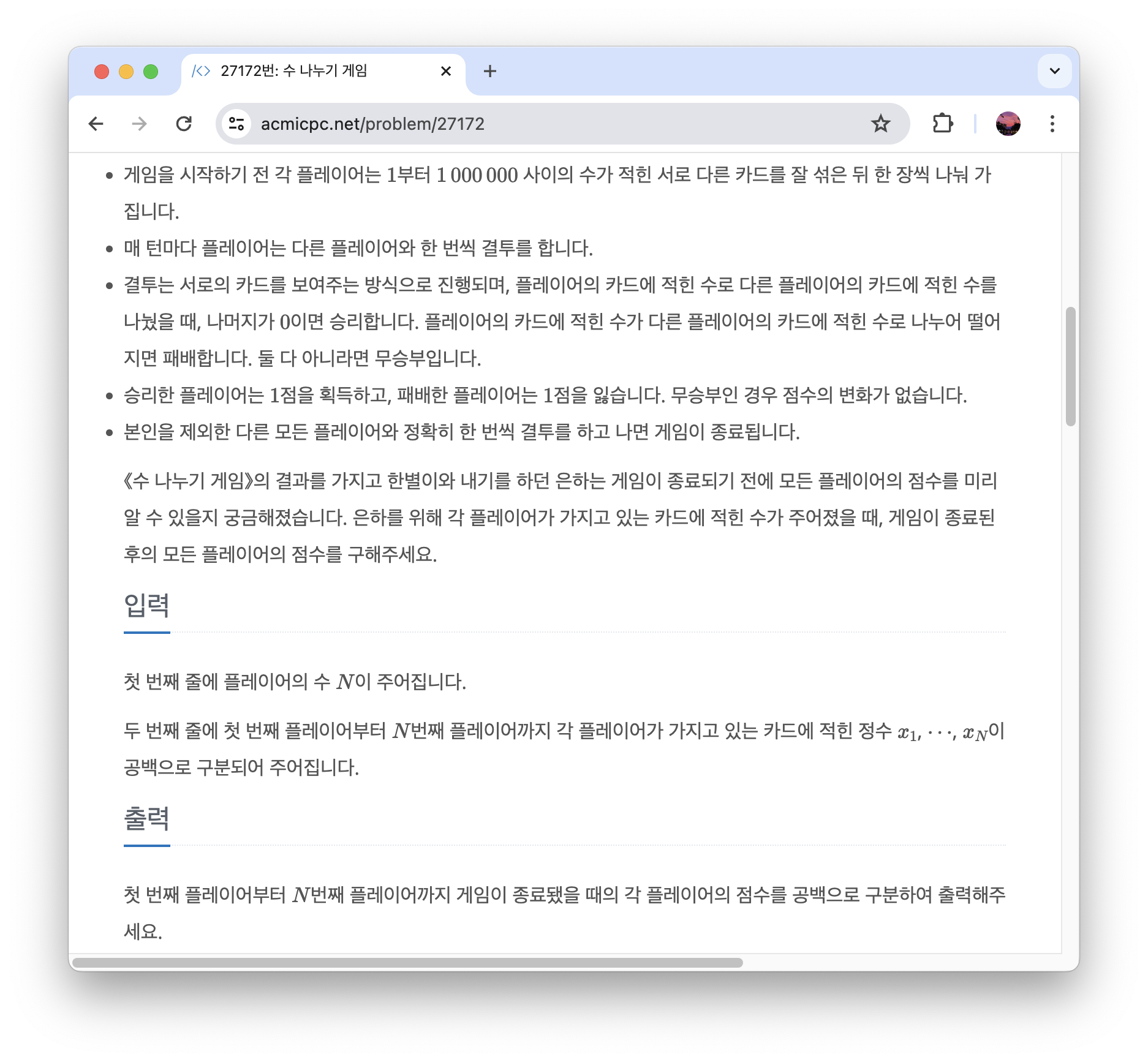 약수면 +1 나누어 떨어졌다면 -1 점을 갖게 되는 게임에서 결과를 출력하는 문제이다.