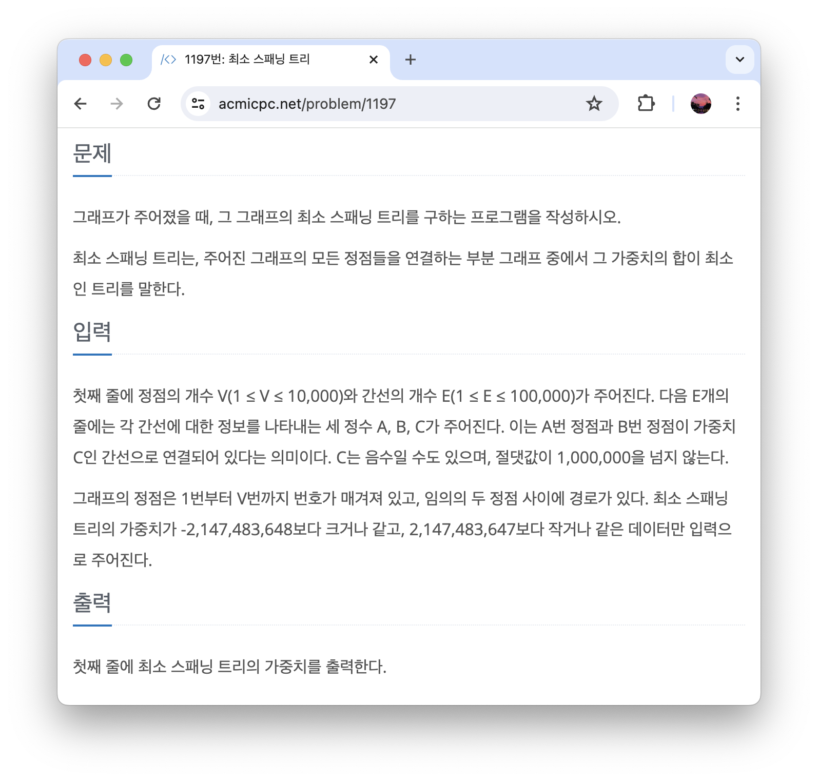 이런 최소 신장 트리는 도로 건설 문제, 네트워크 라우팅 경로, 통신에서 전화선 길이에 사용되는 등 실제 자주 활용되는 자료구조라고 한다. 위 문제는 주어진 간선의 정보를 가지고 최소 신장 트리를 구하는 문제였다.