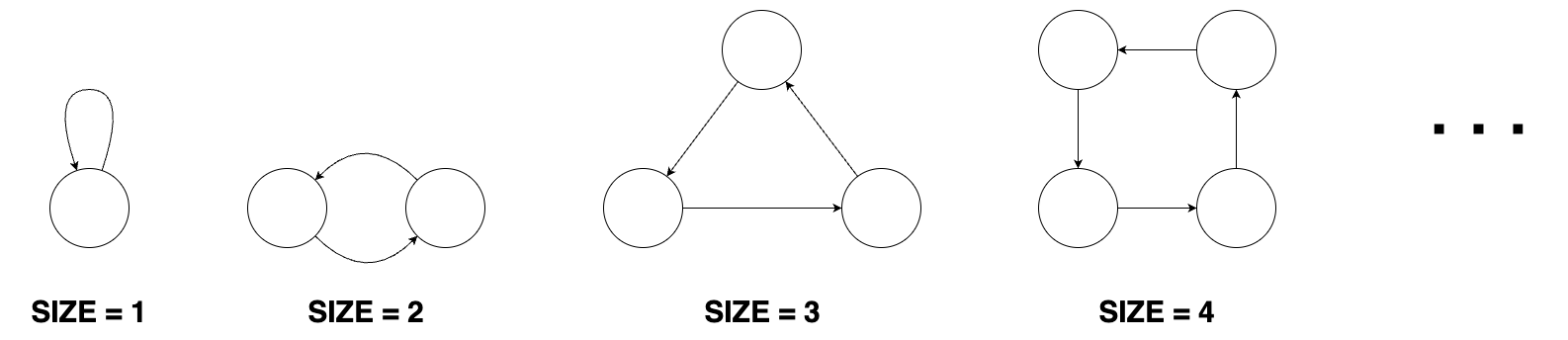 - 크기가 n인 도넛 모양 그래프는 n개의 정점과 n개의 간선이 있습니다. 도넛 모양 그래프의 아무 한 정점에서 출발해 이용한 적 없는 간선을 계속 따라가면 나머지 n-1개의 정점들을 한 번씩 방문한 뒤 원래 출발했던 정점으로 돌아오게 됩니다. 도넛 모양 그래프의 형태는 다음과 같습니다.