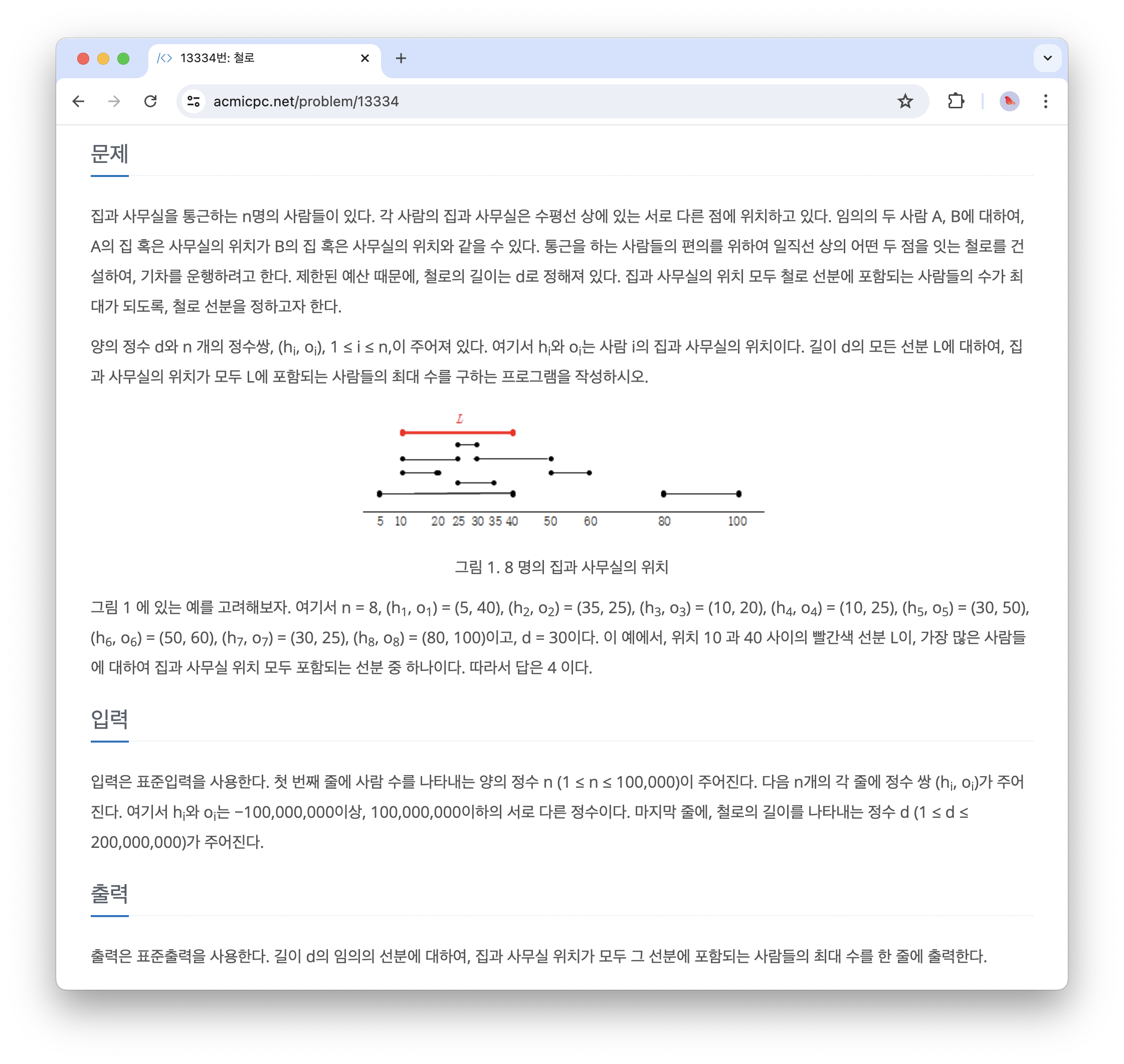 가장 간단한 풀이방법은 철로를 계속 한 칸씩 옮겨가면서 확인해 보기. 하지만 이 방법은 철로를 옮길 때마다 새롭게 그곳에 포함되는 선을 찾아야 한다는 점이다. 그렇다면 이 문제는 포함되는 선을 최대한 가져가면서 갱신해 주는 방식으로 사용하면 된다!