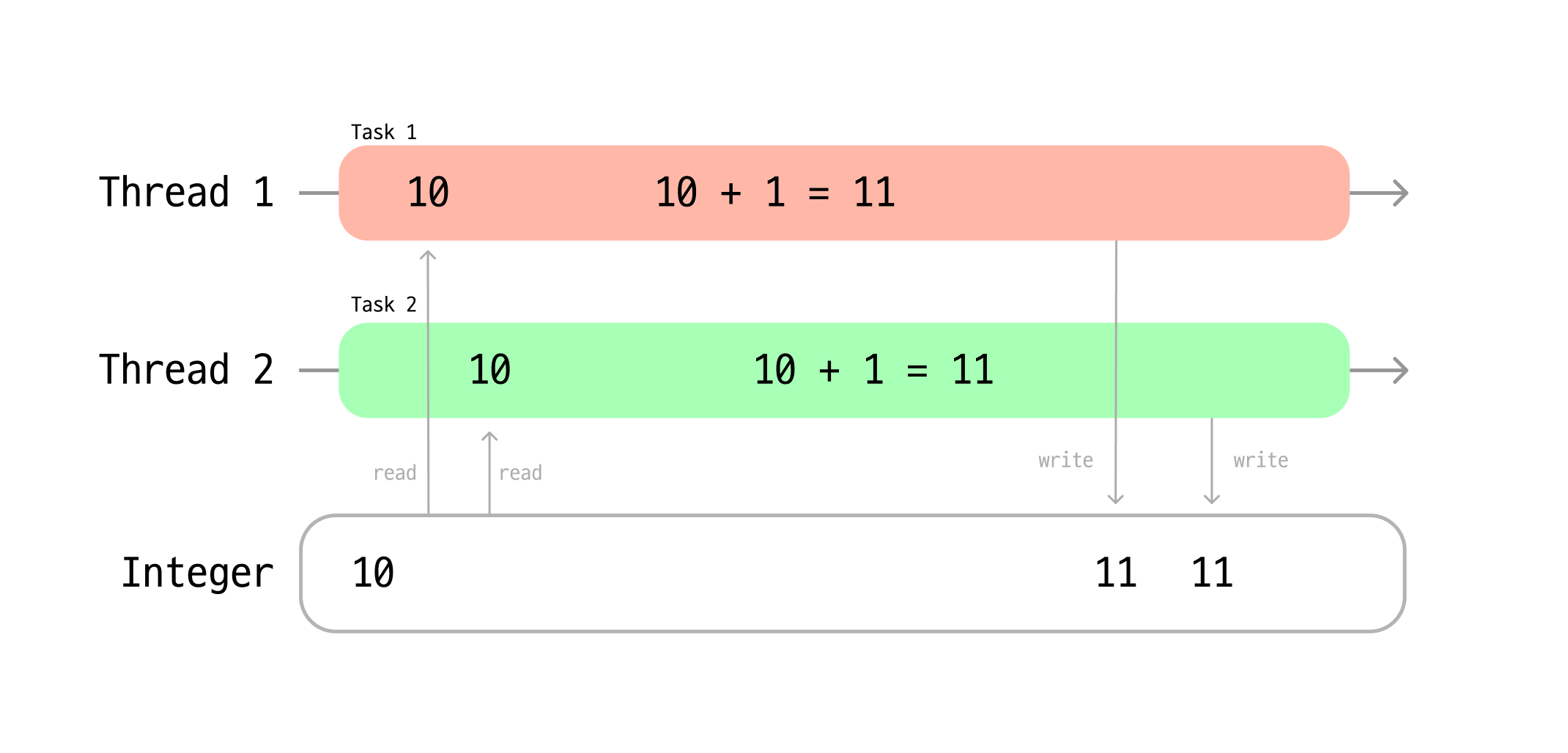 두 개 이상의 스레드가 동일한 데이터에 동시에 접근할 때 발생한다. 하나의 변수에 두 가지 비동기 작업이 이루어진다면 어떻게 될까? 간단하게 그림을 그려보았다. 10 이라는 변수에 1 을 더하는 두 개의 작업이 비동기적으로 이루어 진다면...? 결국 두개의 작업이 경쟁하게 된다. 결과는 11로 나오겠지만 그렇다면 하나의 일은 무의미해지게 된다. 만약 작업이 더 복잡하다면 어떠한 문제가 생길지 모르는 위험한 상황이다!