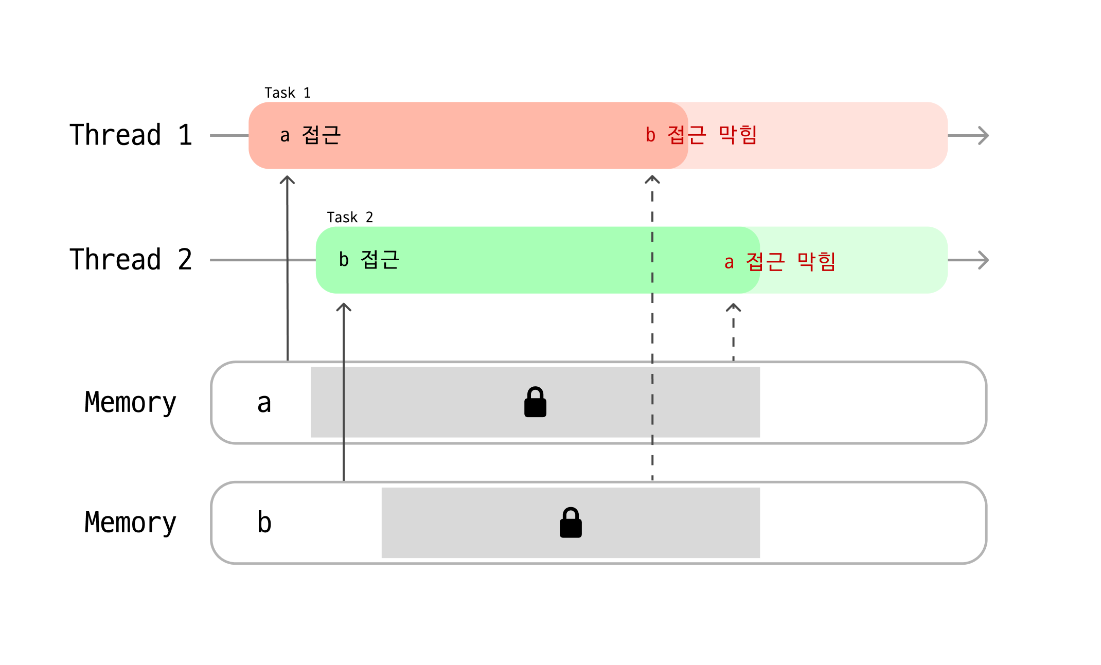 간단하게 그림을 그려서 설명한다면... 두 가지 작업이 각각 서로의 자원을 원하는데 접근이 막혀있어서 서로의 작업이 종료되기를 기다리는 상황이 데드락이다. 두가지 작업이 서로의 작업이 종료되기를 기다린다면 영원히 두가지 작업은 진행이 되지 않을 것이다.