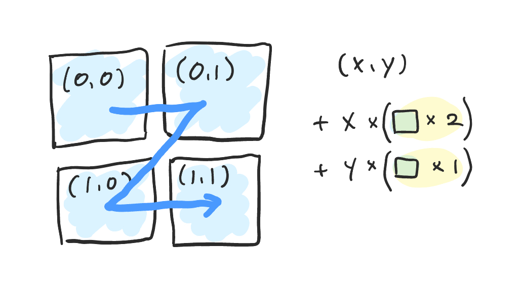 그림으로 이해가 될지는 모르겠지만... (x, y)를 구했다면 x의 경우 (블록 * 2), y의 경우 (블록 * 1)을 곱해줘서 몇번째 순서인지 계속 쌓아나가면 된다!