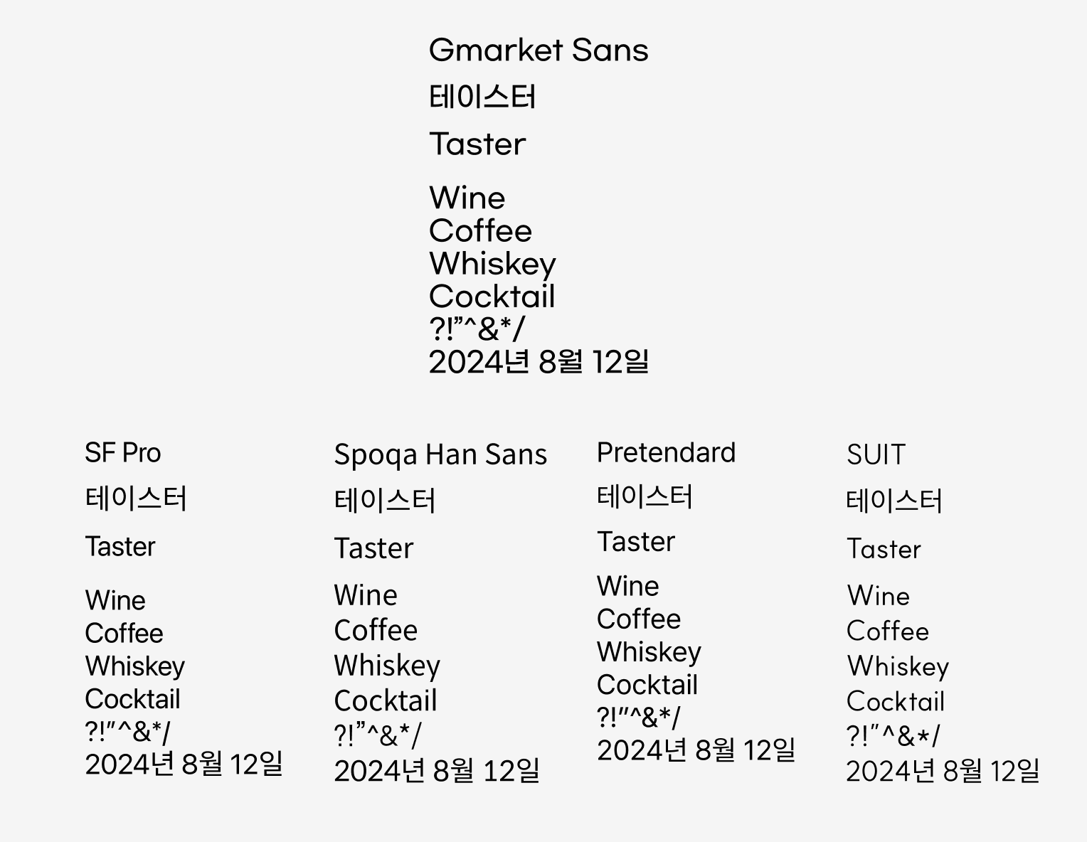 아래와 같이 후보군은 기존의 SF Pro, Spoqa Hans Sans, Pretendard와 추가된 Suit폰트까지 총 4개의 폰트를 고려했다. 다 너무너무 좋고 많이 쓰이는 폰트여서 고민이 많이 되었지만 결국 내 맘에 드는 폰트를 고르기로 했다. SF Pro의 경우 한글은 넓은데, 영어는 좁은 느낌? 이 들어서 패스... SUIT의 경우 대문자와 소문자의 크기가 너무 차이나 보여서 패스...