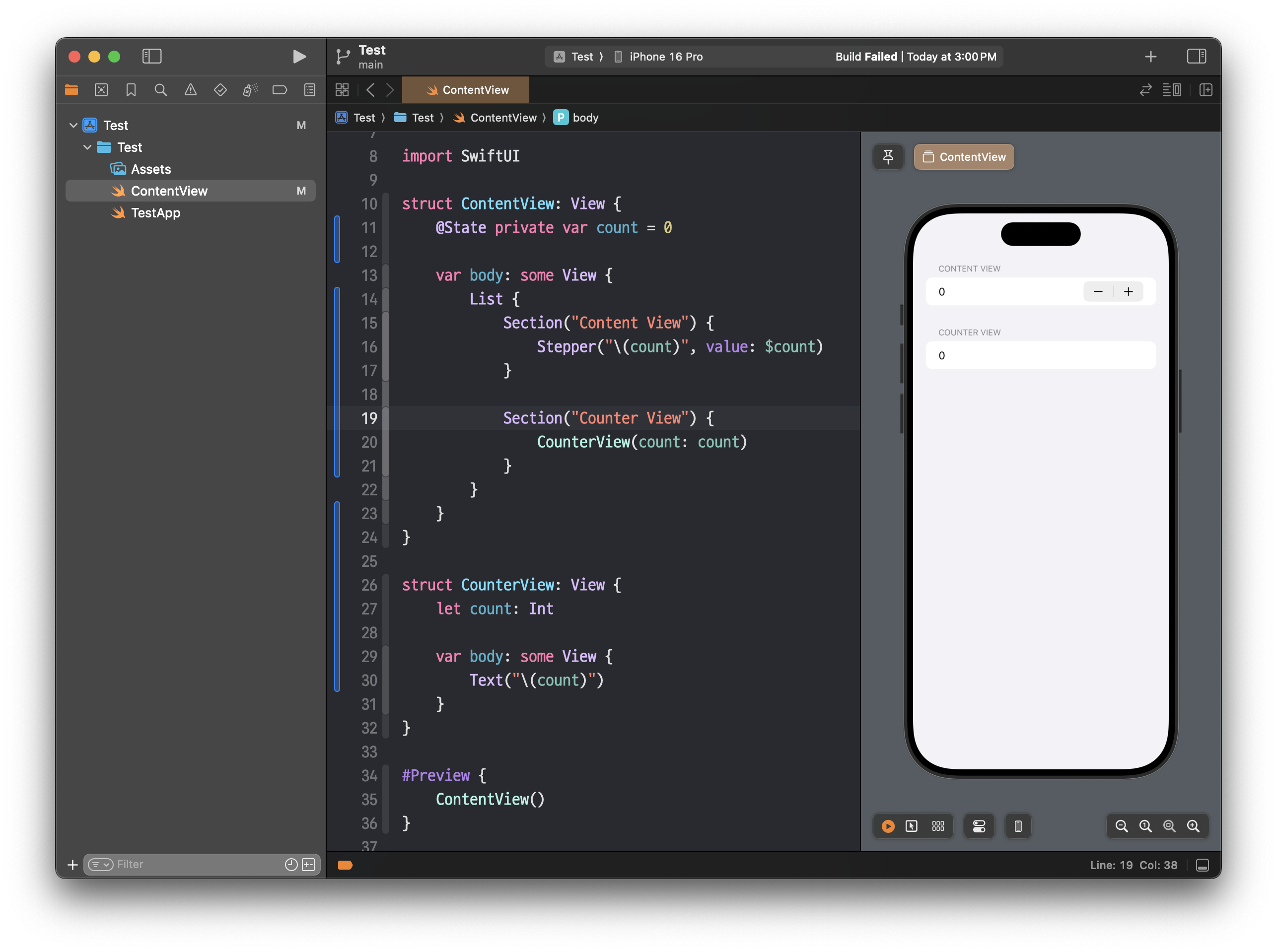 그렇다면 의문이 생겼다. @State로 선언된 변수는 뷰를 업데이트 시키는 것으로 알고 있는데 var count: Int로 받은 CounterView가 어떻게 업데이트 되는 걸까? 우선 아래와 같이 let count: Int로 변경시켜 보았다. 그래도 뷰가 업데이트 되는걸 보니 count를 표시하는 뷰는 아예 다시 생성된다는 유추를 해볼 수 있다.