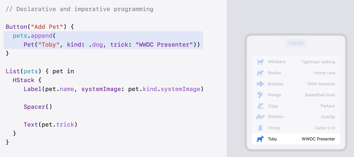 명령형과 선언형이 동시에 적용되어있다고 할 수 있다. 버튼같은 경우 어떠한 Action을 할지 분명하게 명령하고 있고, List의 경우는 알아서 pets를 표시해준다.