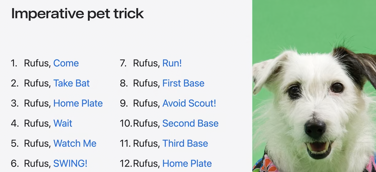 아래와 같이 Rufus라는 멍멍이(객체)가 있다면 아래와 같은 과정으로 Rufus가 홈런을 치게 만들 수 있다. 하나하나 어떻게 해야하는지 명령한다고 해서 명령형 프로그래밍이다.