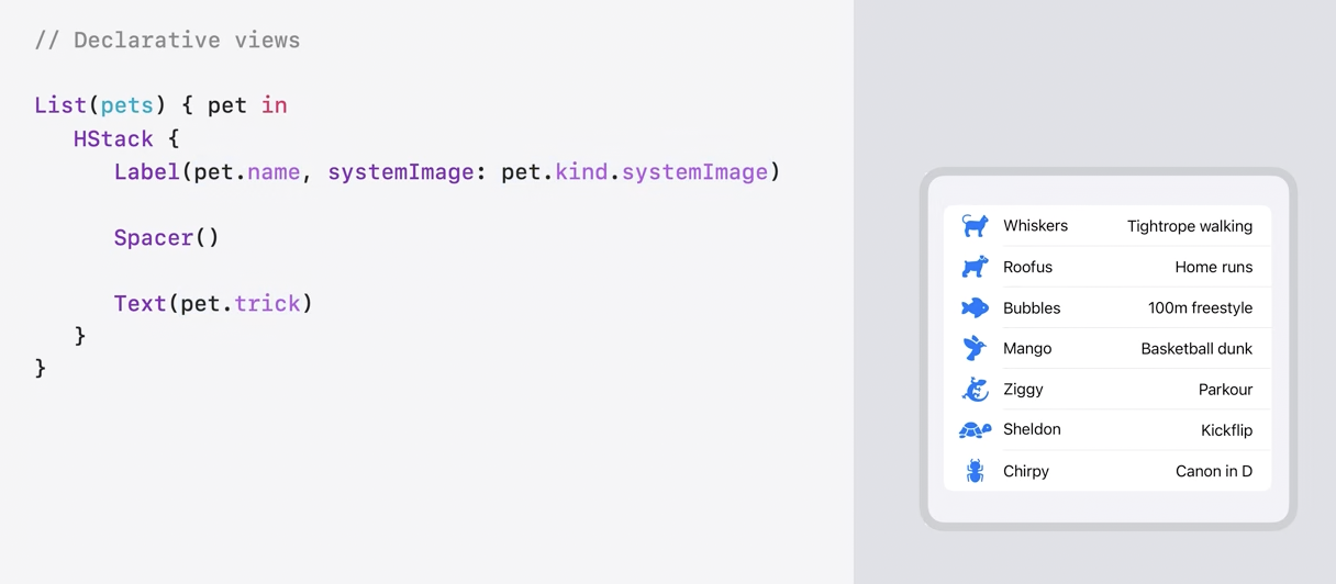 SwiftUI는 다음과 같은 세가지 특징이 있다. 선언적, 구성적, 상태 중심의 특징을 가지고 있다. 아래와 같이 원하는 뷰를 행을 추가하거나 제거하는 작업 없이 UI를 만들 수 있다. pets가 업데이트 된다면 자동으로 행이 변경될 뿐이다.