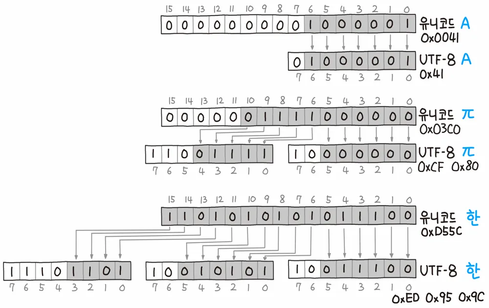 영어의 경우 알파벳이기 때문에 예를 들면 한글의 경우 1바이트로 표현을 못하기 때문에 2~3바이트로 표현을 하게 된다. 현재는 4바이트까지 써서 다양한 언어와 이모티콘까지 표현하게 되었다. 이것을 유니코드라고 한다.