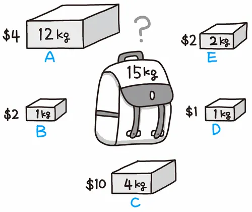 그렇다면 어떻게 해야 계산을 최대한 줄일 수 있을까? 배낭에 물건을 넣는다고 해보자. 배낭에 물건을 넣다가 15kg이 초과했다. 그러면 배낭에 물건을 더 이상 넣을 수 없거니와 그 뒤에 경우의 수는 생각할 필요도 없다.