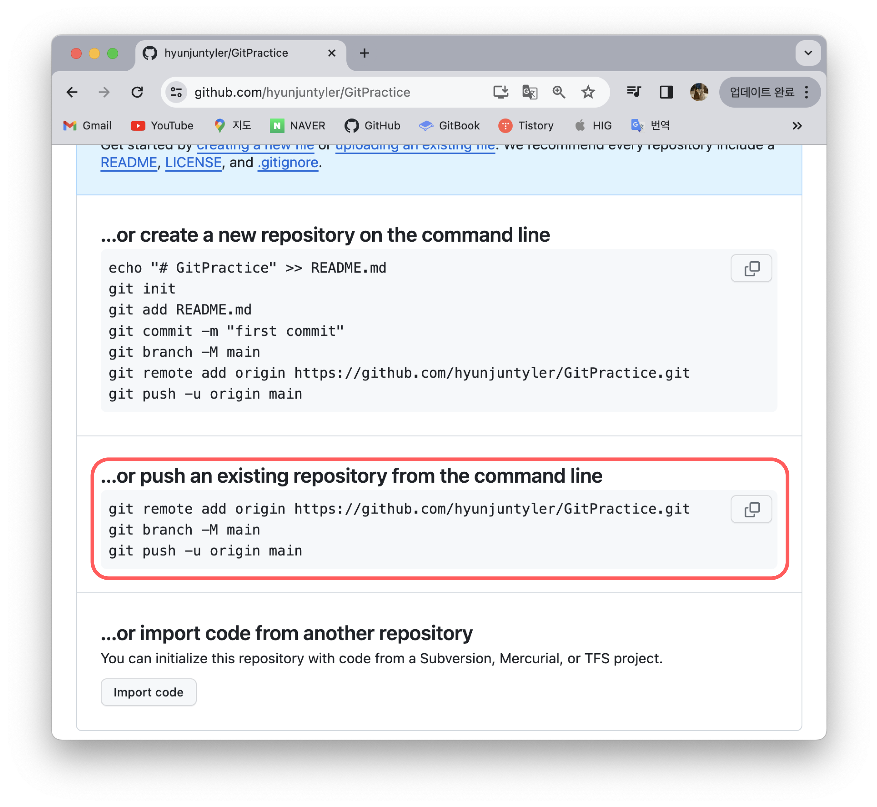 아래의 명령어를 입력해주면 된다. 첫번째 줄은 원격 저장소를 연결하는 명령어, 두번째 줄은 원격 저장소에 코드를 업로드 하는 명령어 이다.