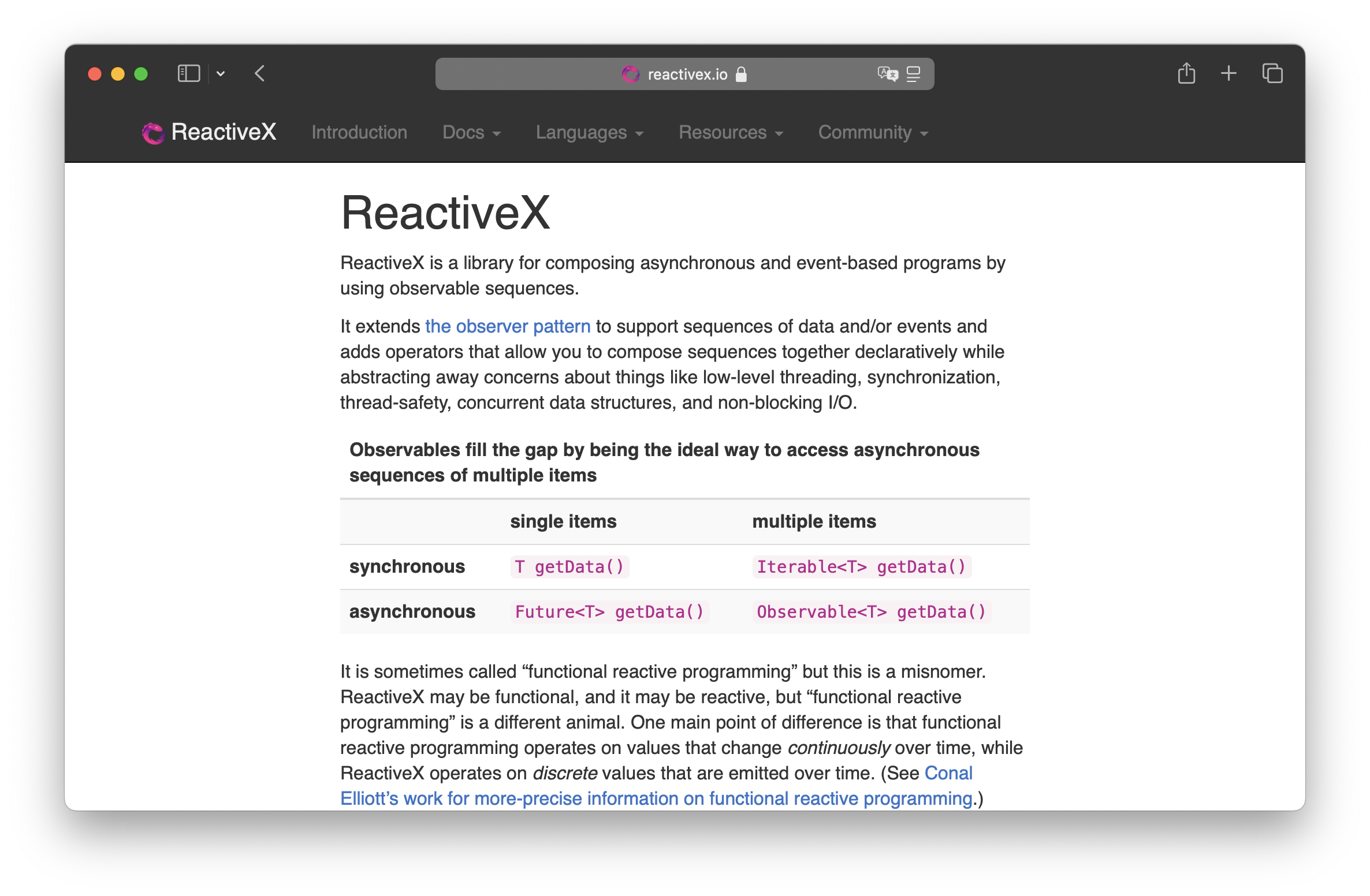 Rx를 Reactive Functional Programming과는 다르다고 한다. 가장 큰 차이점은 FRP의 경우 시간의 흐름에 따라 변경되는데 비해, 값이 특정 순간에만 발생한다고 한다. RFP의 경우 시간에 따라 끊임없이 변하는 값을 다루는 방식이라고 하고, Rx의 경우는 이벤트가 발생할 때 값이 바뀐다고 한다. (이 부분은 RFP에 대한 더 깊은 이해가 필요할 것 같다)