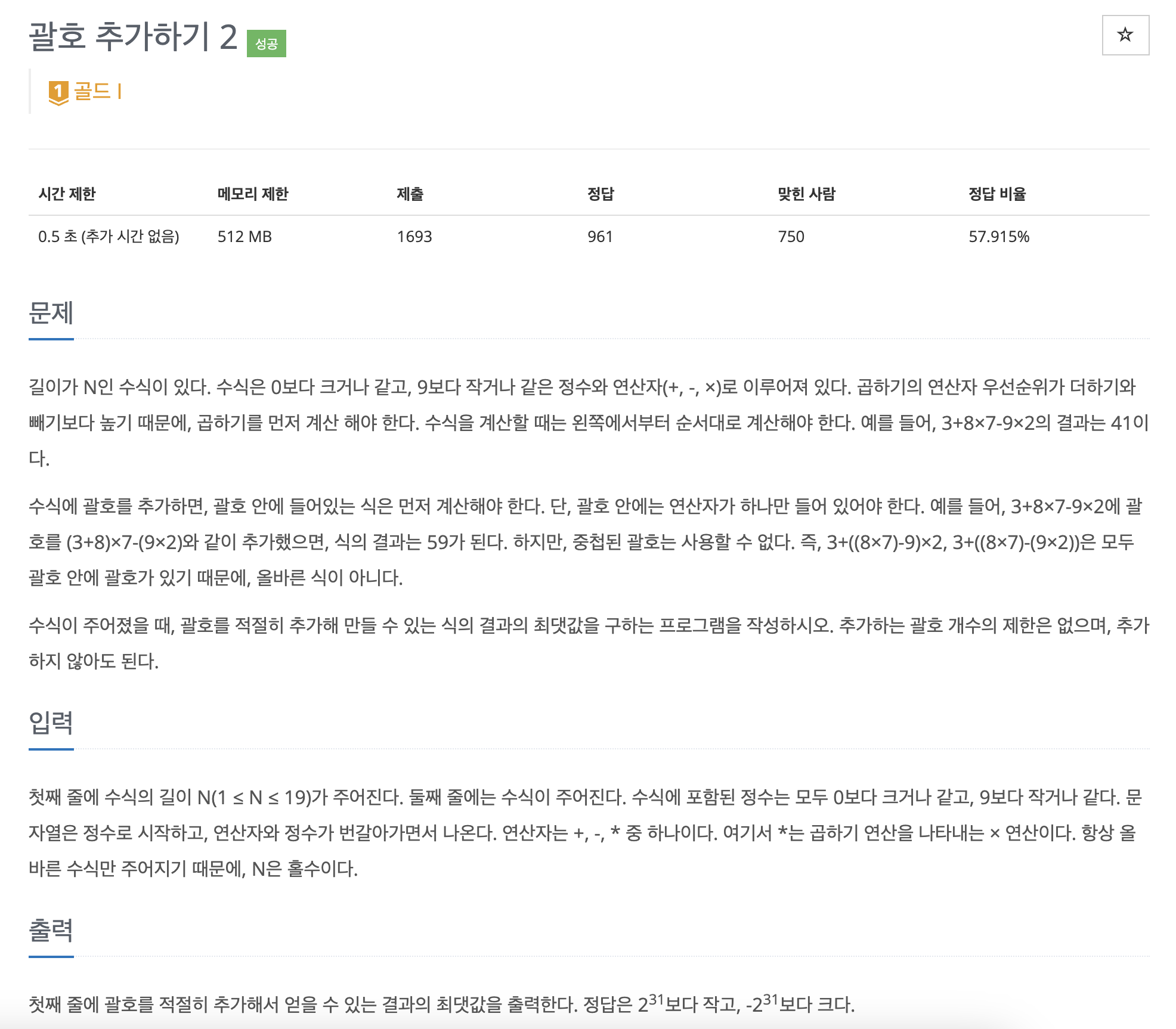 괄호, 곱하기, 그외 연산자 순으로 연산을 진행하면 되겠다라고 생각했다. 그리고 괄호는 중복되면 안되기 때문에 오른쪽부터 괄호를 씌우게 하지만 이전에 괄호가 있다면 무조건 한칸 건너띄게 괄호를 넣을 수 있게 했다.
