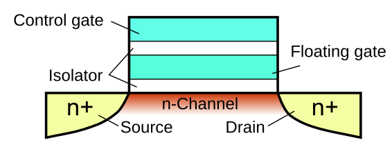 플로팅 게이트 트랜지스터는 아래와 같이 생겼다. 이러한 플로팅 게이트가 모여있는 것이 플래시 메모리 이다. 이러한 플래시 메모리, NAND 플래시 메모리 방식으로 만든 것이 SSD라고 한다.