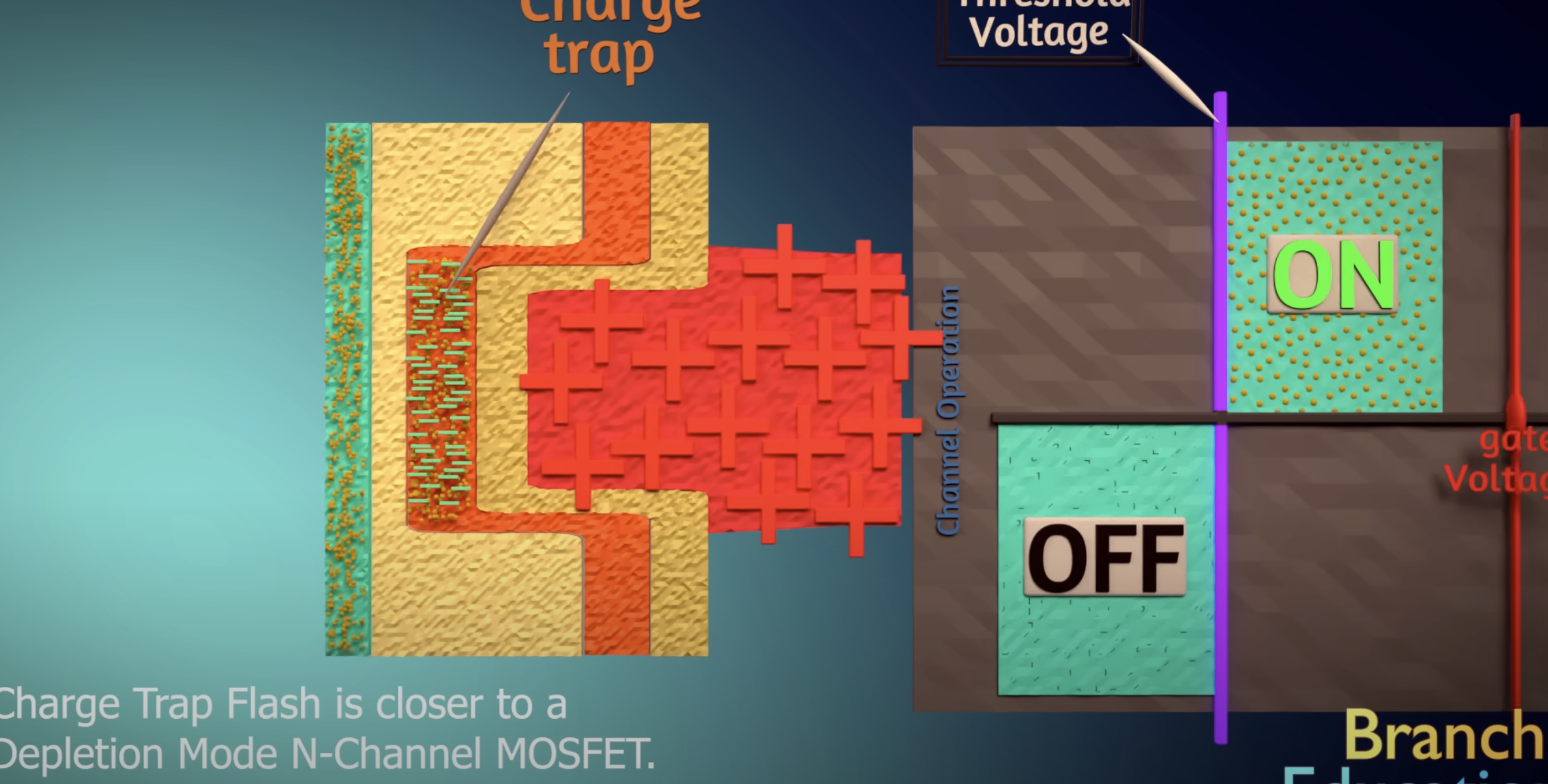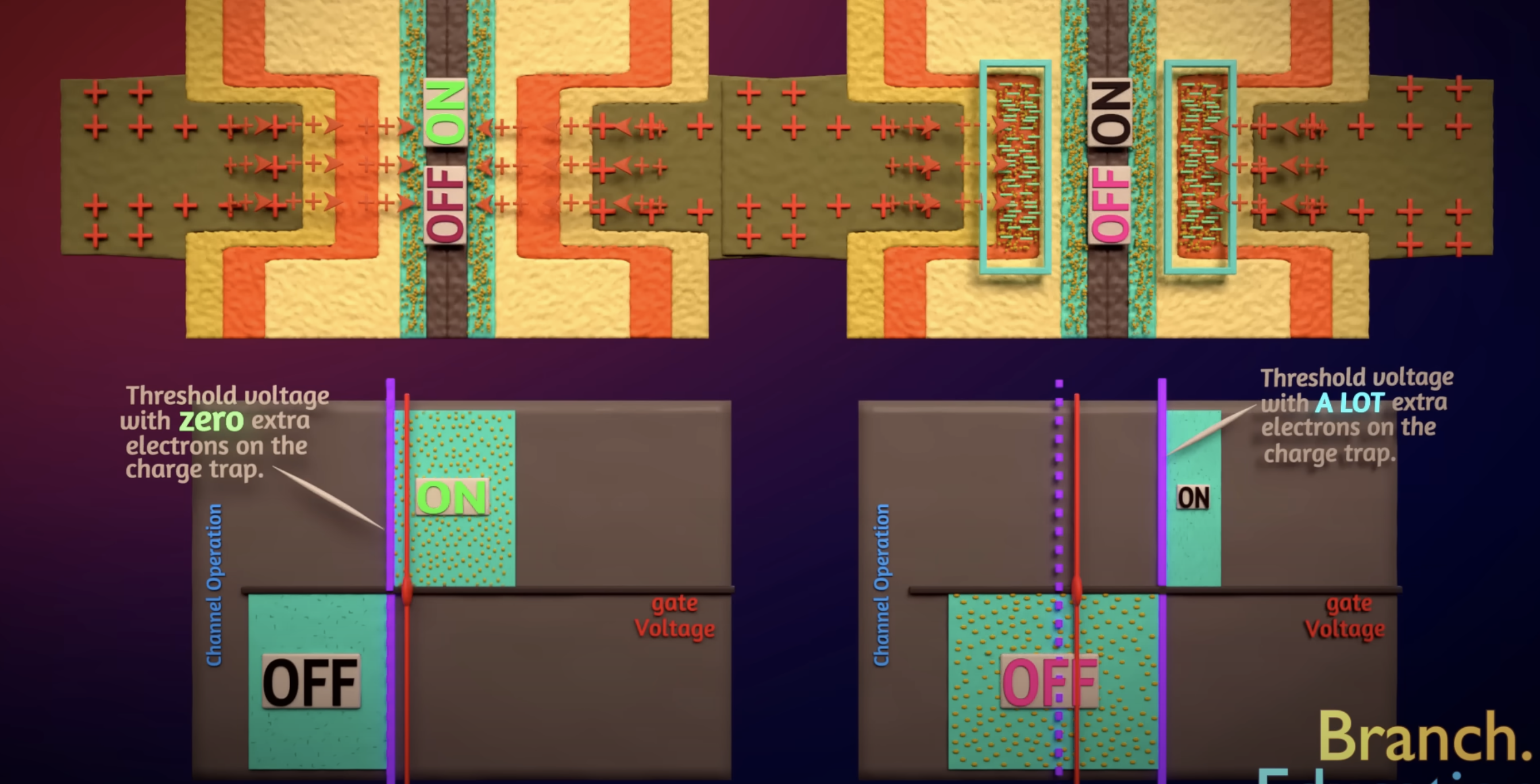 전하가 갖혀있게 된다면 아래와 같이 전자를 흐르게 하기 위해서 더 큰 전압이 필요한데 이 차이가 데이터가 된다고 생각하면 될 것 같다.