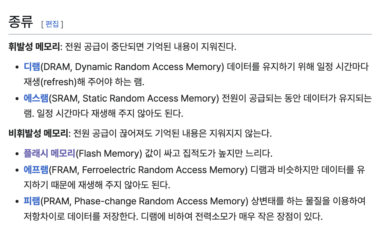 여기서 RAM이 일반적으로 비휘발성 메모리라고 했는데, 전원이 꺼져도 지워지지 않는 PRAM, MRAM 처럼 NVRAM(Non-Volatile RAM)같은 RAM이 있기 때문이다. 하지만 전통적으로 구분 할 때는 휘발성, 비휘발성으로 크게 나누는 것 같다.