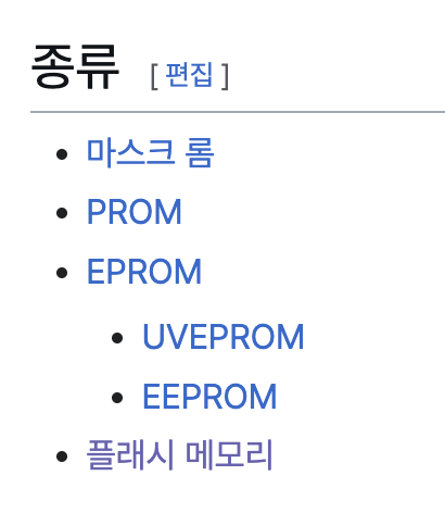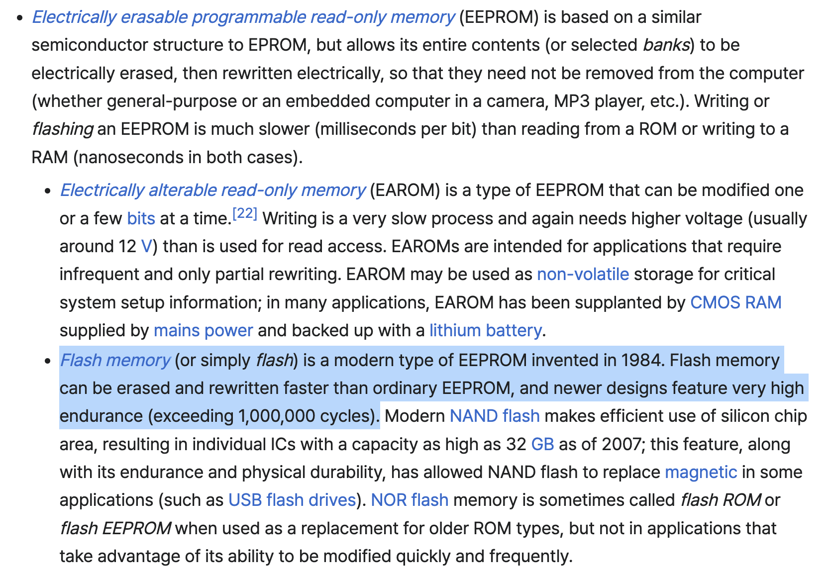 여기서 플래시 메모리는 사실 ROM에서 발전되었지만 데이터를 페이지 단위로 접근하고 읽고 쓰기가 가능하기 때문에... 위키피디아 한글에서는 플래시메모리가 ROM, RAM의 종류에 둘다 들어가 있지만 아예 새로운 카테고리로 생각해야 할 것 같다.