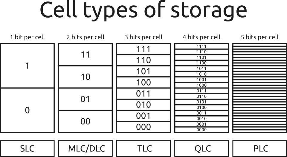 이전에는 전하가 있거나 없거나로 1비트의 개념(SLC, Single Level Cell)이었다면 현재에는 플로팅 게이트에 전하 수준을 세밀하게 제어하여 더 많은 수를 표현할 수 있다(MLC, Multi Level Cell)