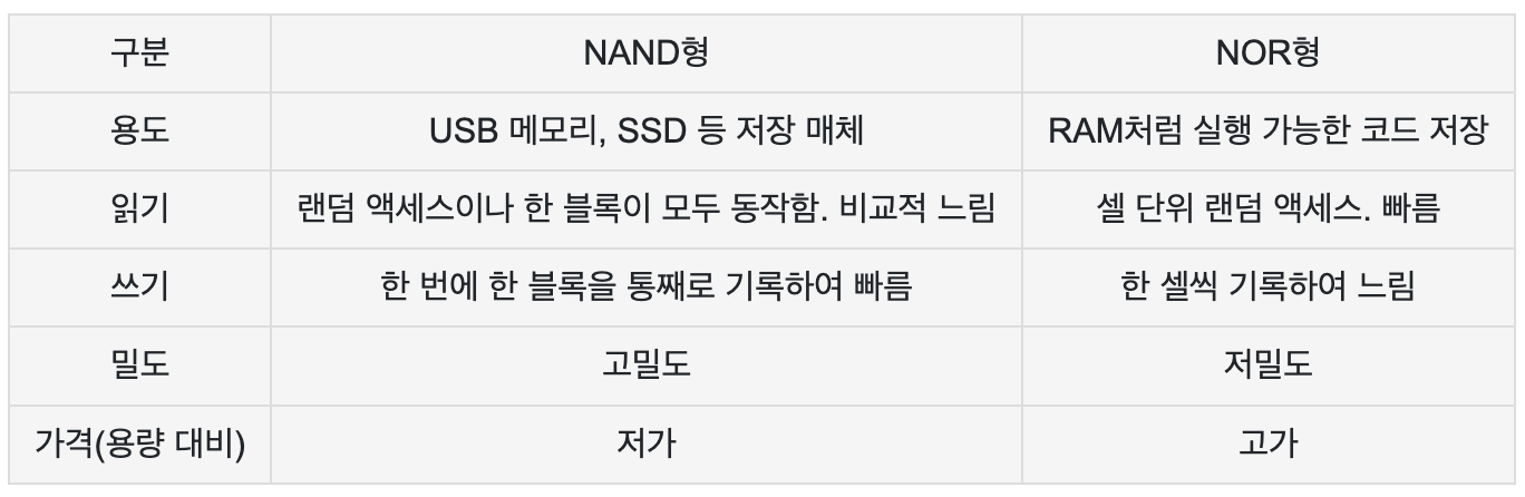 플래시메모리는 빠른속도로 읽고 쓴다고 해서 Flash라는 이름이 붙었다고 한다. 대표적으로는 NOR, NAND 플래시가 있다.