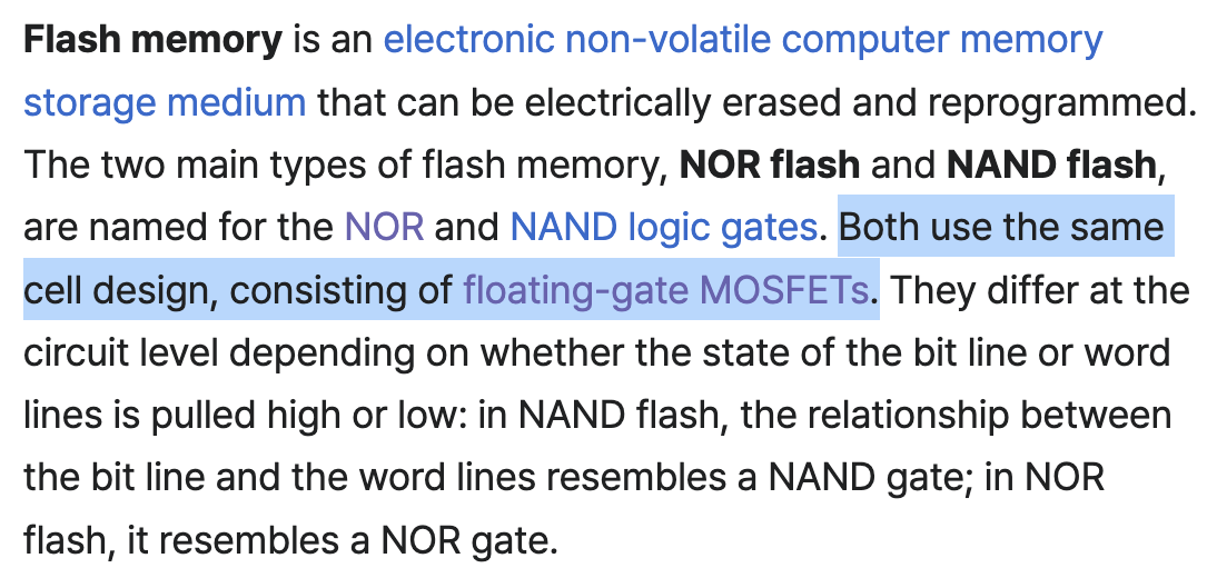 NOR 플래시, NAND 플래시 둘다 플로팅 게이트 MOSFET을 사용하게 된다.