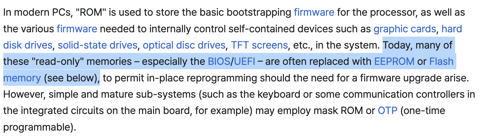 메모리는 크게 휘발성, 비휘발성으로 나뉘는데 ROM은 비휘발성 메모리, RAM은 일반적으로 휘발성 메모리이다. Read-Only Memory의 약자인 ROM은 전원을 꺼도 데이터가 지워지지 않기 때문에 컴퓨터의 바이오스(Basic Input Output System)나 펌웨어, 운영체제를 저장하는데 쓰였으나 최근에는 플래시 메모리로 대체되었다고 한다. (위키)