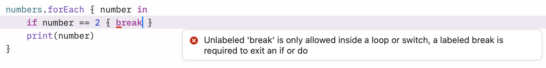 /// 1. You cannot use a `break` or `continue` statement to exit the current