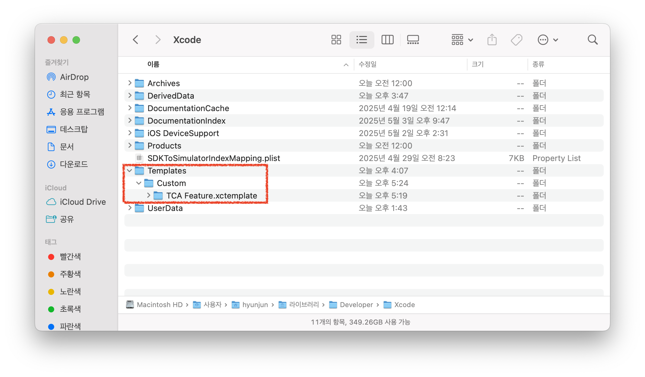들어가서 Templates라는 폴더가 없다면 만들어주고, 그 아래에는 Custom같은 아무 폴더를 만들고 다운받은 .xctemplate 폴더를 넣어주면 된다.