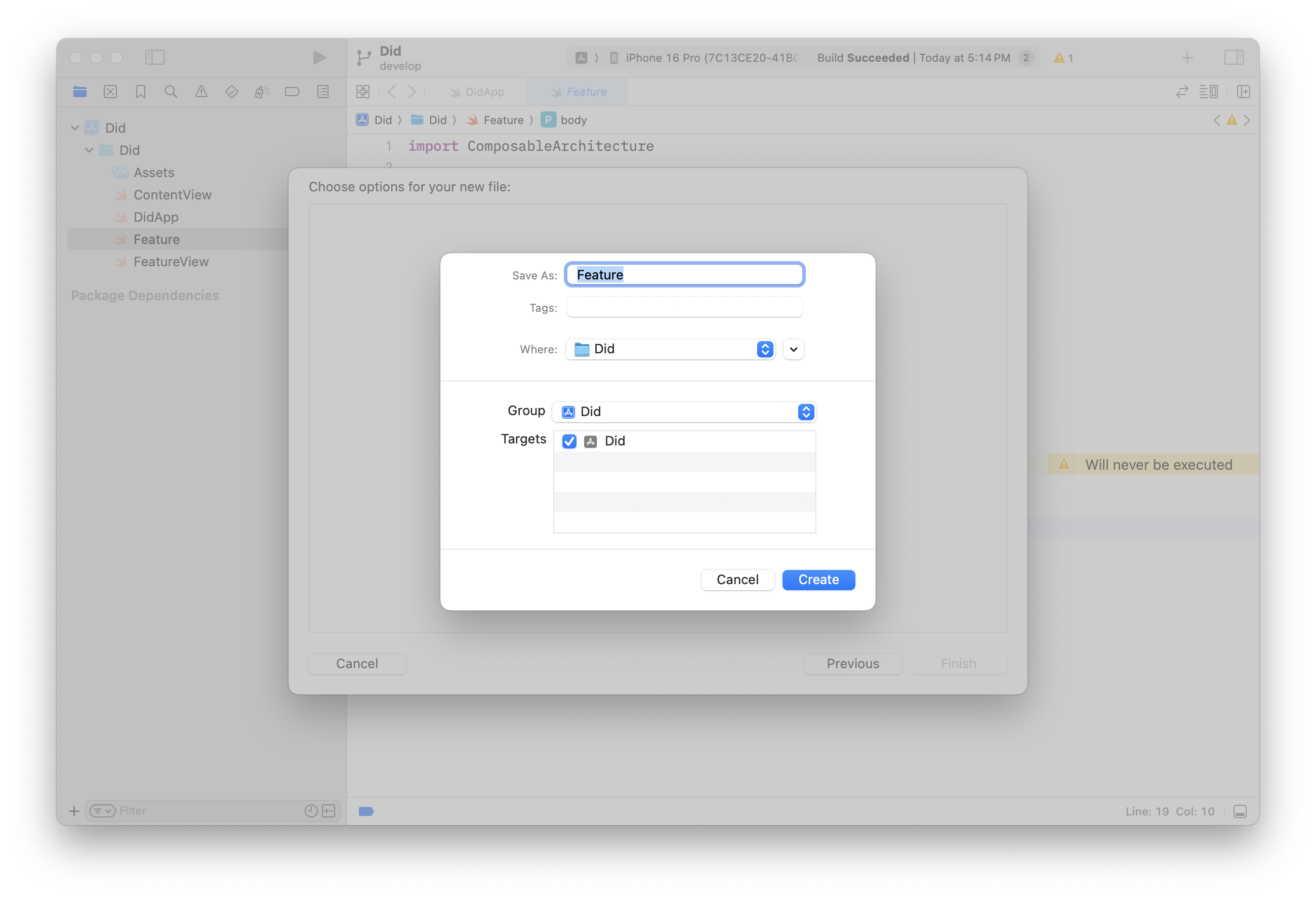 개선이 필요하겠지만 첫번째 템플릿은 아래와 같이 Feature이라는 이름을 넣게 되면 자동으로 @Reducer struct Feature { ... } 와 FeatureView 가 생성된다. Feature 대신 다른이름을 넣으면 그 이름 그대로 만들어 준다. Preview도 간단하게 만들었다.