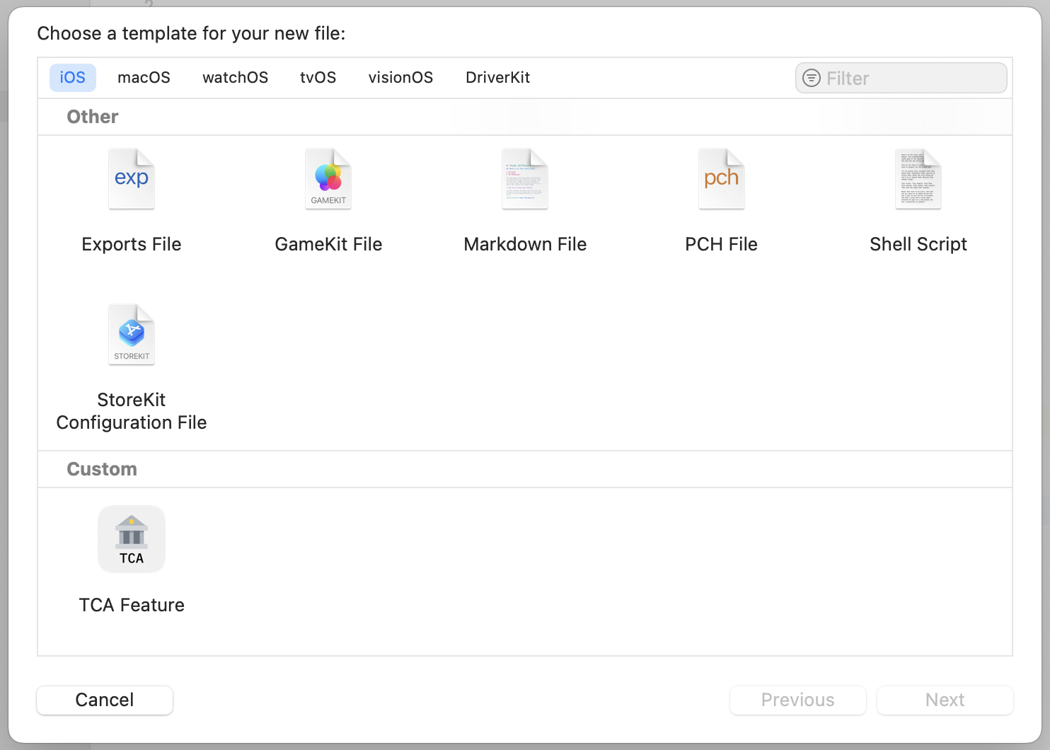 아무 폴더나 만들라는 것은 나같은 경우 Custom을 만들었는데 그렇게 되면 아래와 같이 Custom 섹션에 TCA Feature이라는 템플릿이 들어가게 된다. (역시 아이콘이 있어야 심심하지 않다)