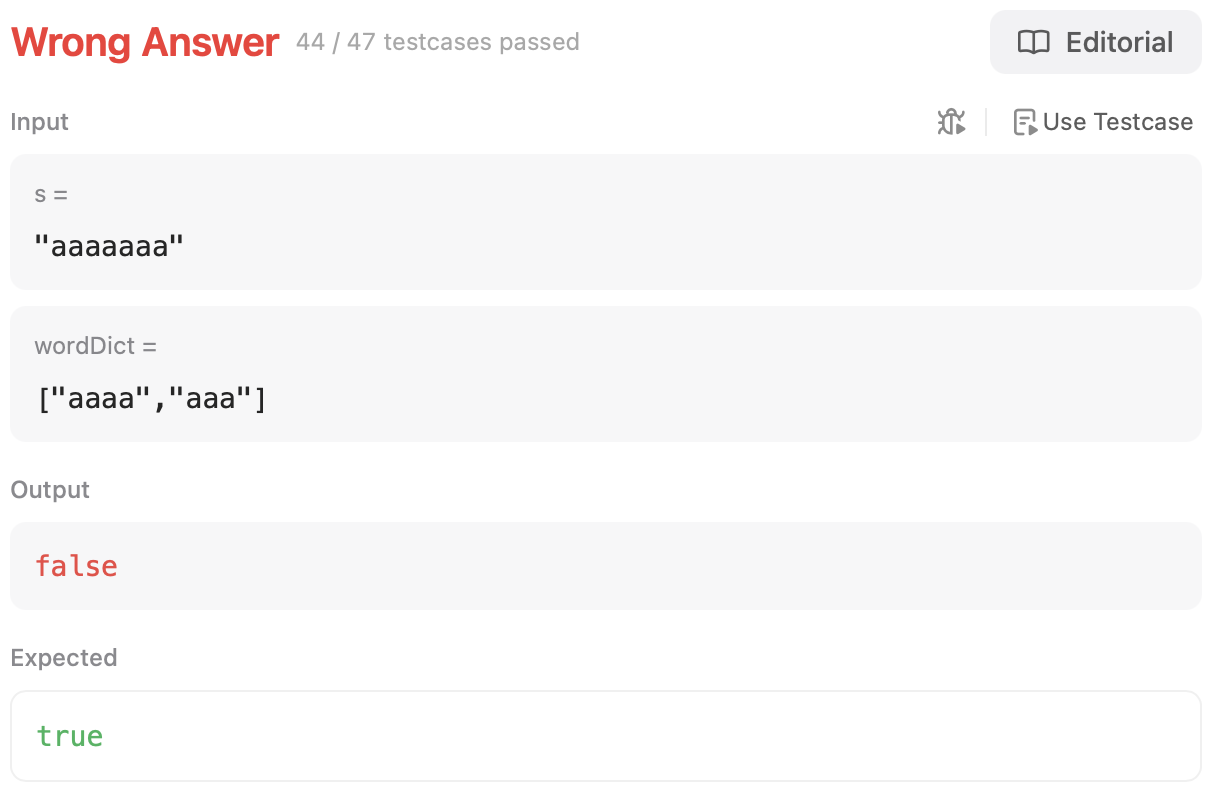 하지만 이 풀이는 s = "aaaaaaa" wordDick = ["aaa", "aaaa"] 일때 바로 실패했다. ☠️ 왜냐하면 결국 a가 남기 때문에...!