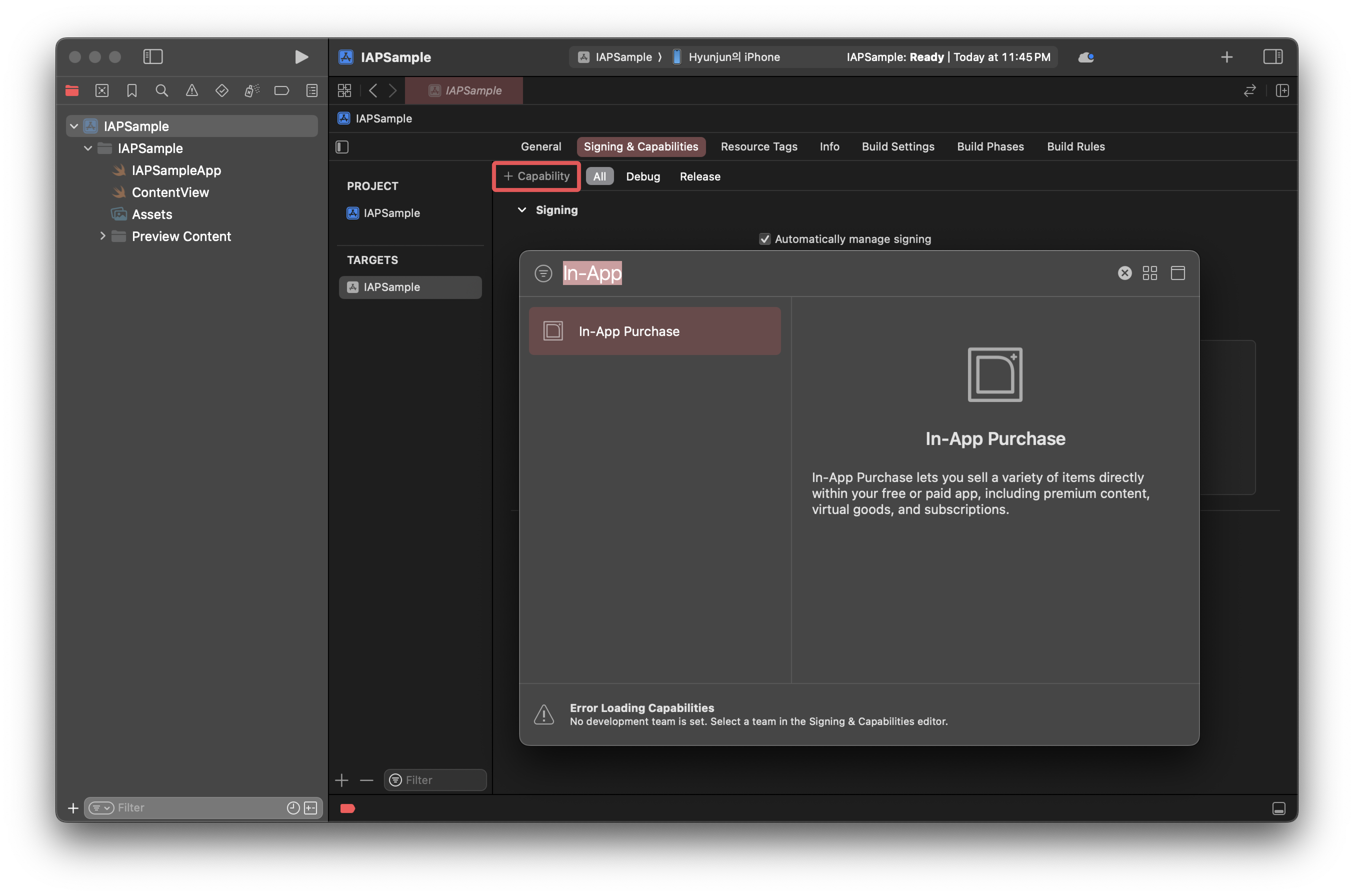 우선 인앱결제를 사용하기 위해서는 App Store Connect 와 연결된 아이디가 필요하다. 그리고 좌측 상단의 + Capability 를 눌러 In-App Purchase 를 추가해준다.