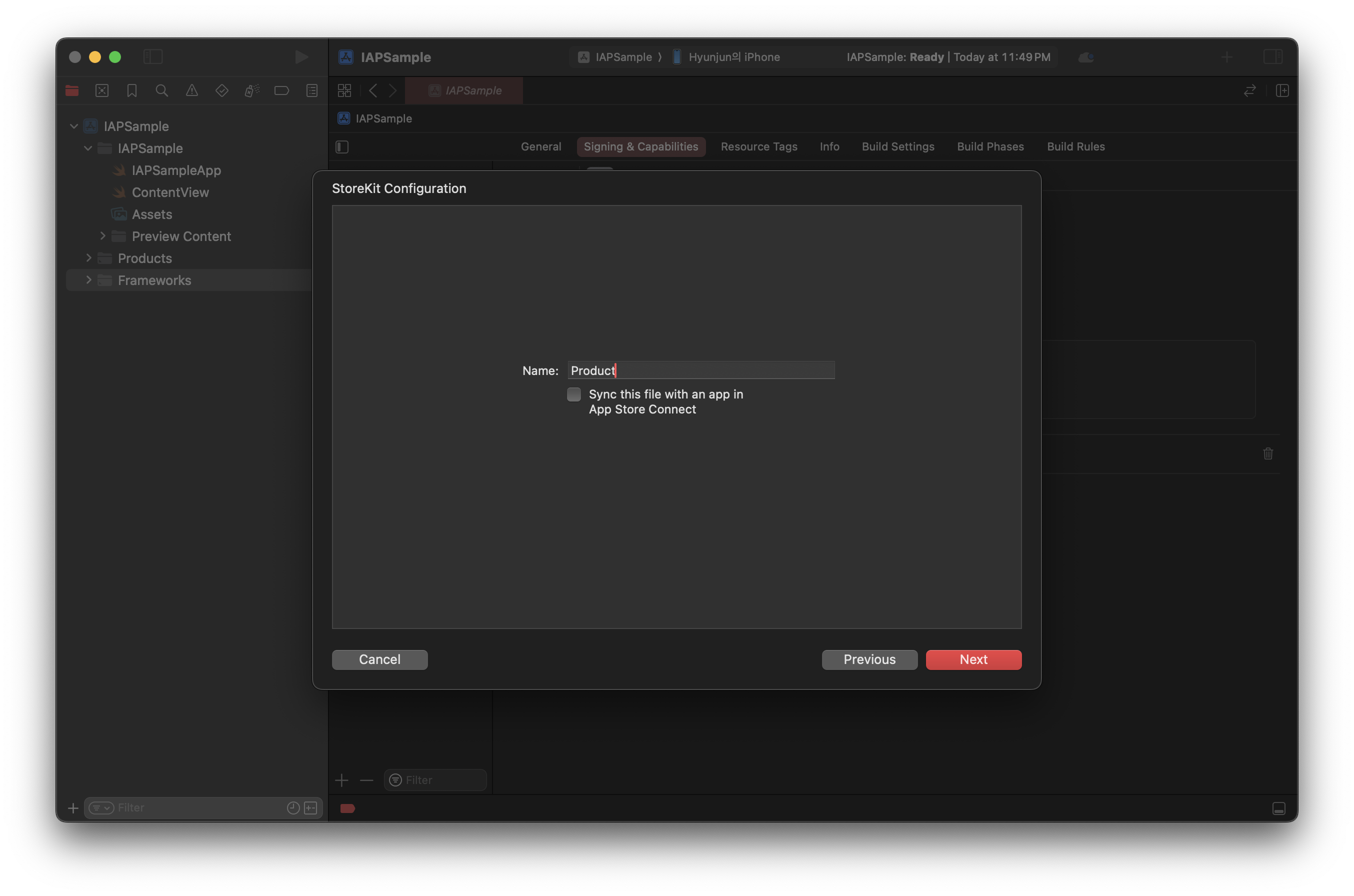 아래와 같이 Sync this file... 체크하지 말고 Product 파일을 만들어 준다. 추후 테스트 후 App Store Connect 설정 이후에 연결된 파일을 다시 만들어 줄 것이다.