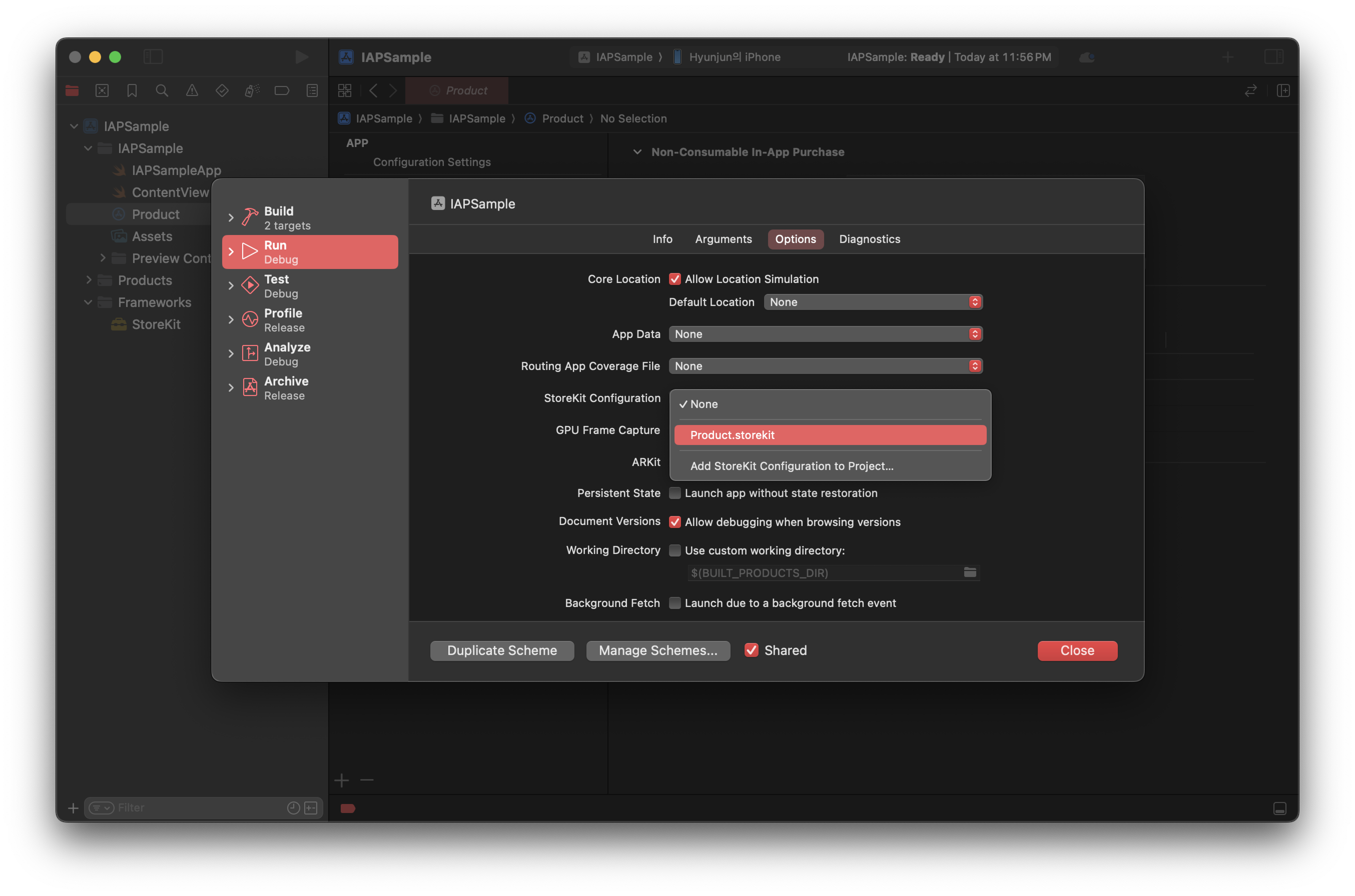 Product → Scheme → Edit Scheme 로 가서 Run 탭에서 StoreKit Configuration 파일을 선택해준다.