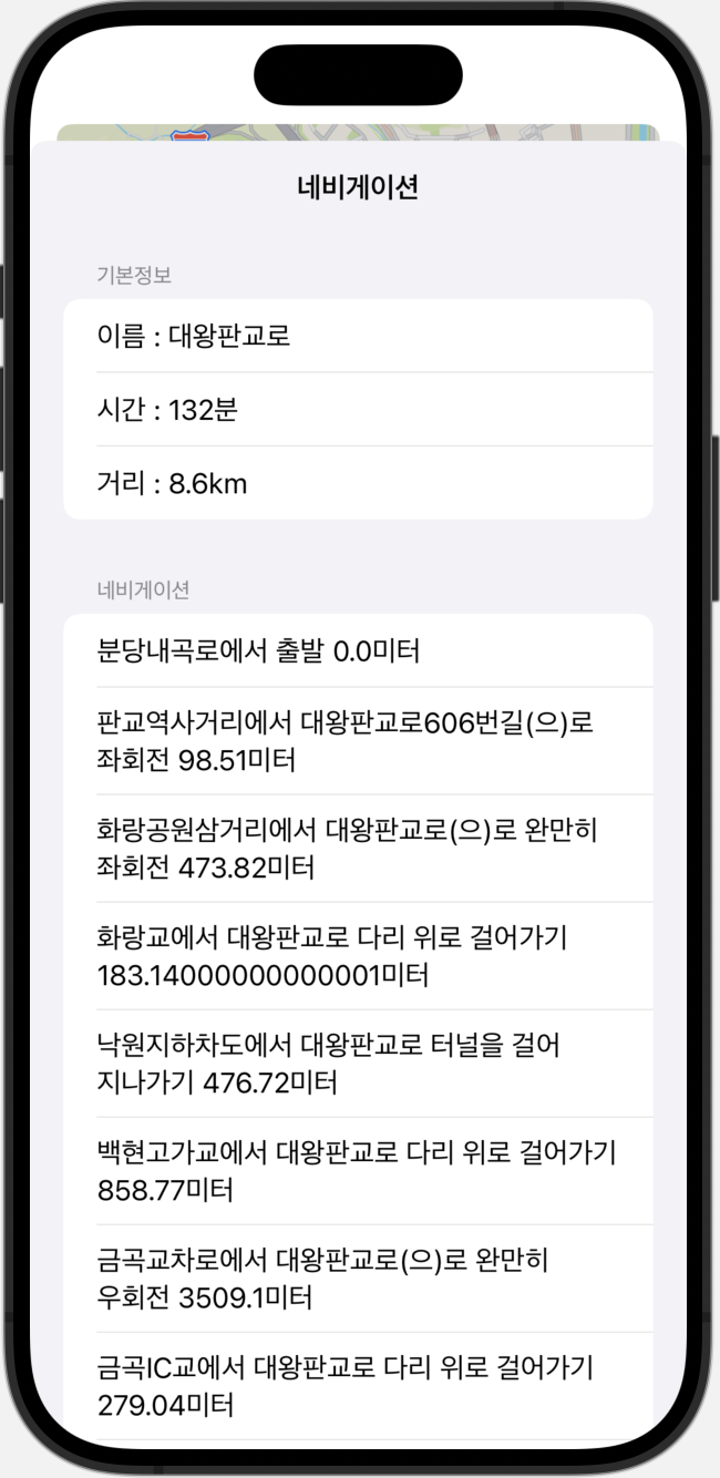 source, destination 을 설정해준뒤 MKDirections(request: ) 를 통해 결과값을 받는다. MKRoute 를 MapPolyline 에 넣어주고, 나머지 name, time, distance, navigation 을 넣어주면 된다.