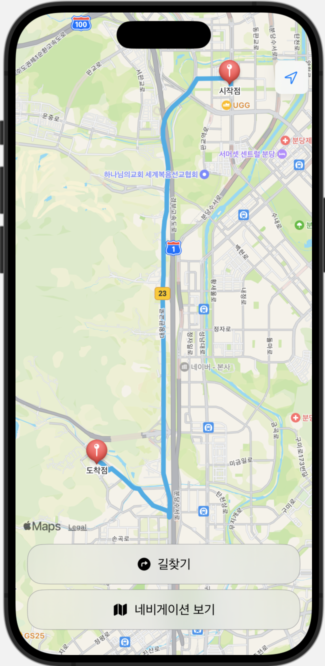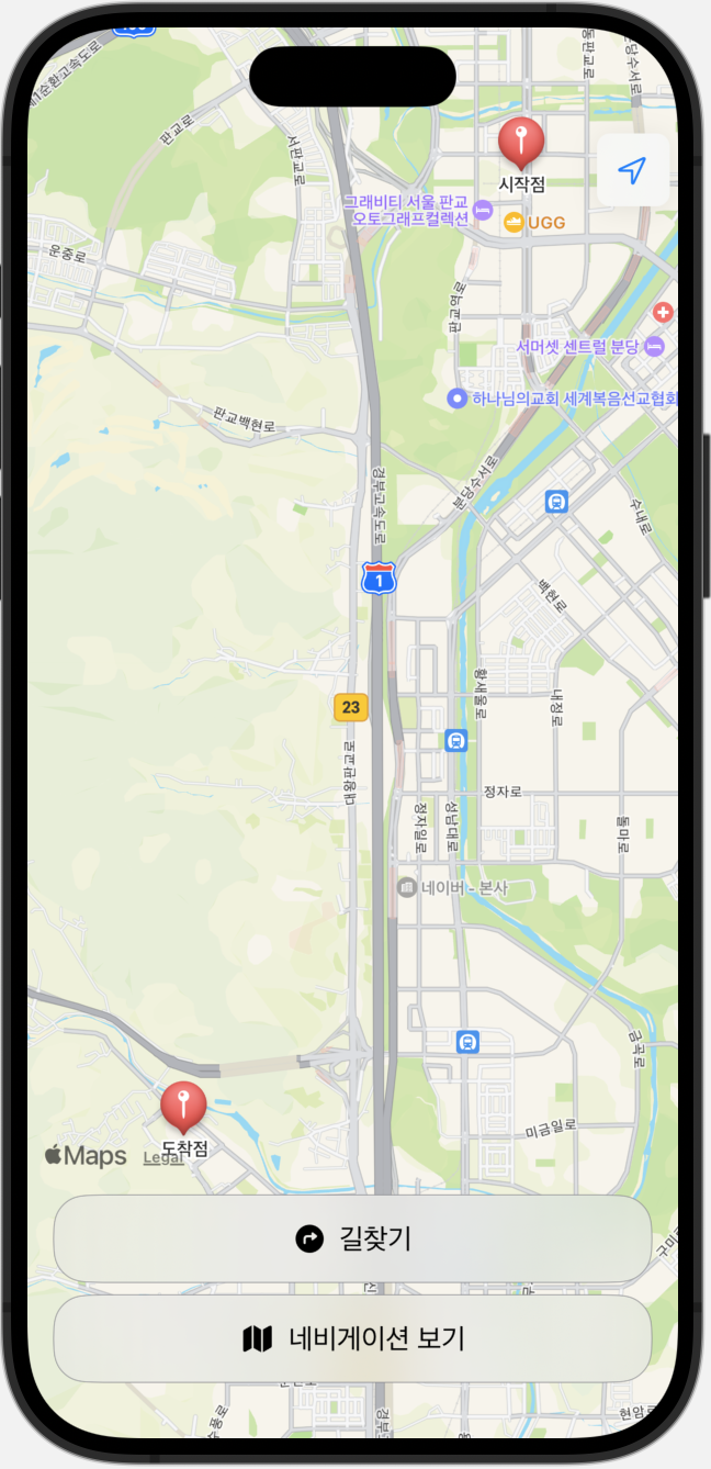 새로 업데이트 된 MapKit 을 활용하여 길찾기, 네비게이션을 구현해 볼 것이다. 아래와 같이 길찾기를 하면 길찾기 결과가 맵에 보이고, 네비게이션을 누르면 네비게이션 안내가 나오게 된다.