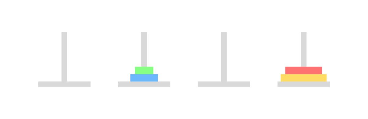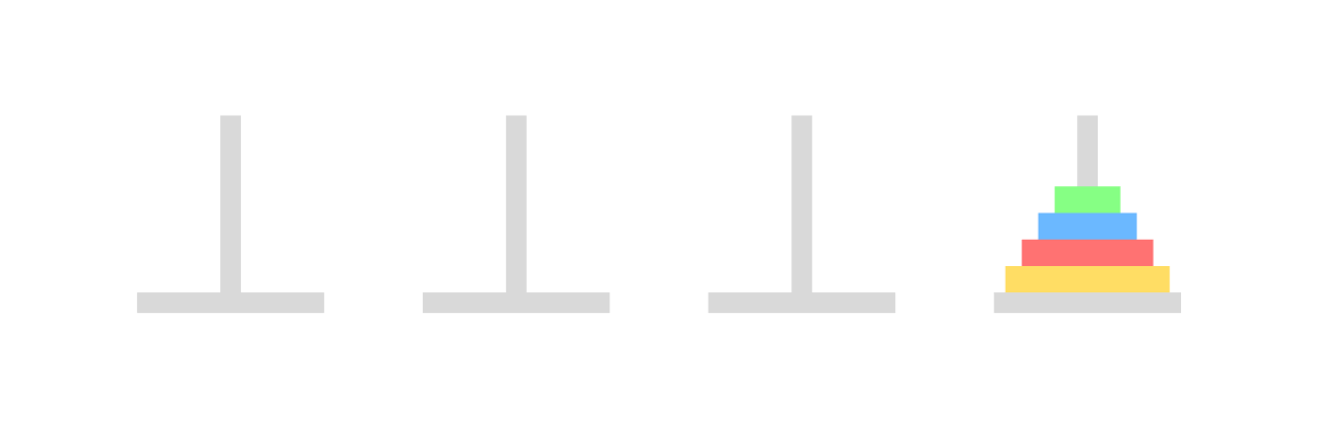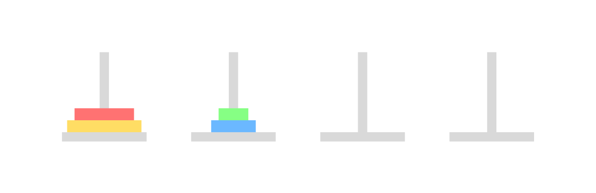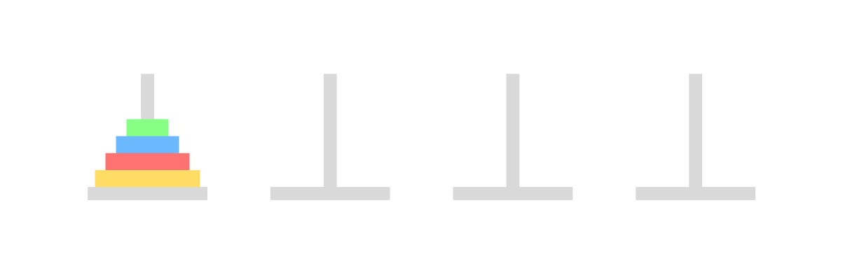 아래와 같이 원판 4개가 있다고 생각해 보자. 이것을 최소한으로 3번 기둥에 옮긴다면?