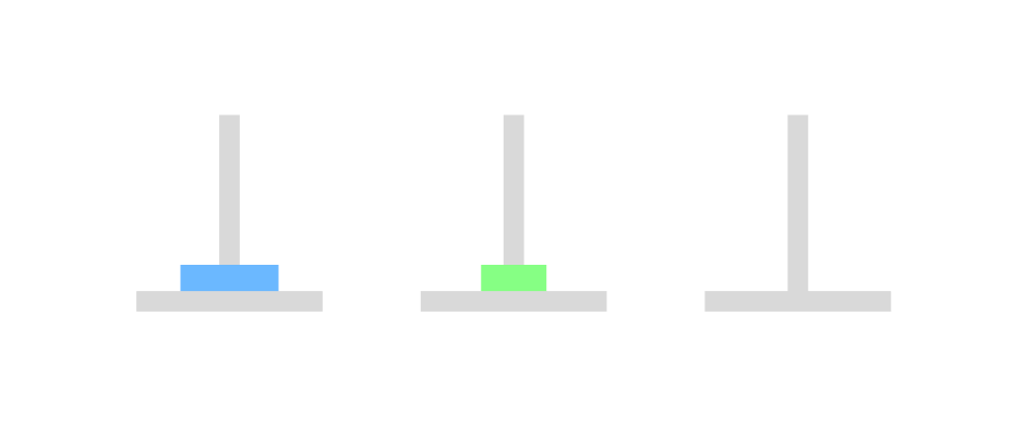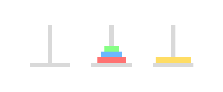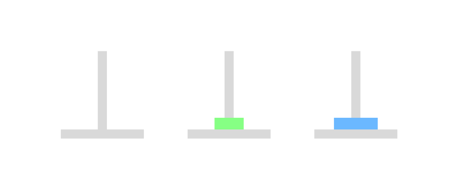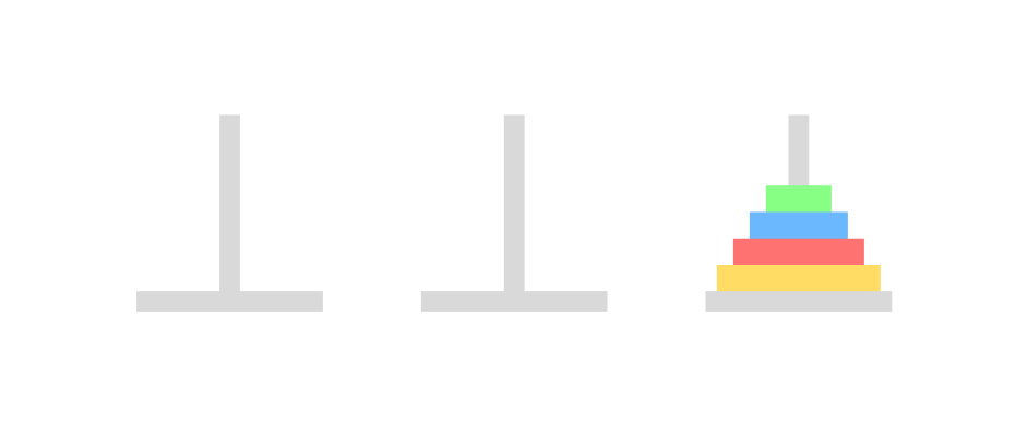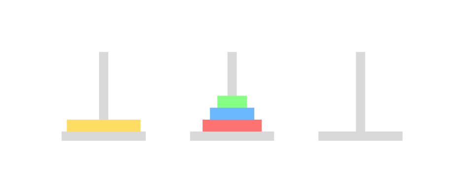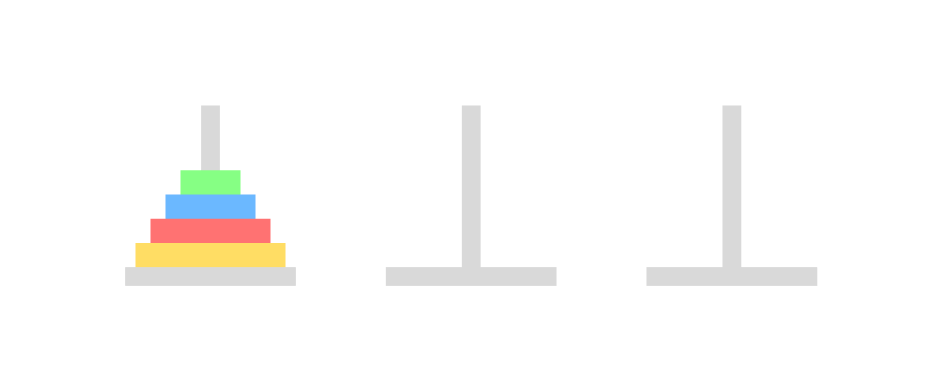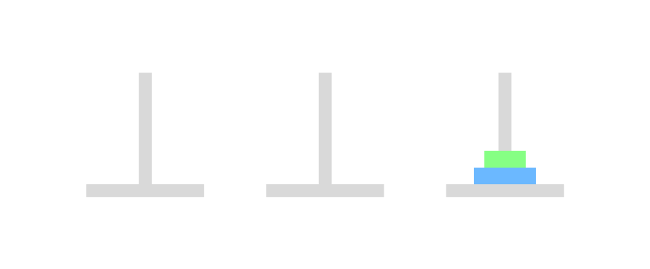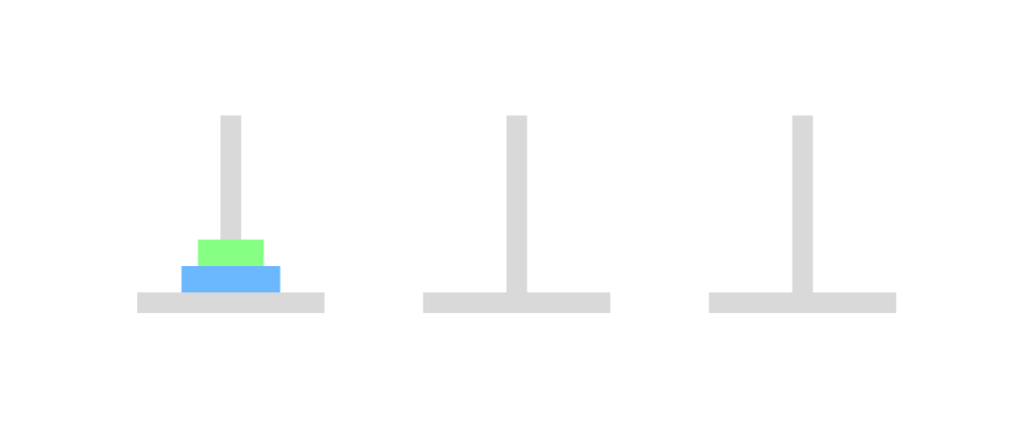 아래와 같이 세 개의 기둥이 있고, 크기가 큰 원판부터 기둥에 꽂혀있다. 이제 이것을 크기가 작은 원판이 크기가 큰 원판보다 아래로 가지 않게 하면서, 한 번에 하나의 원판을 이동하며 세 번째 기둥으로 옮길 때 최소로 옮기는 방법을 return 하는 문제였다. 예를 들면, 2를 입력하게 된다면 2개의 원판이 1번에 있고, 이 원판을 세 번째 기둥으로 최소로 옮기는 방법은 [[1, 2], [1, 3], [2, 3]] 으로 총 세 번 옮기면 된다.