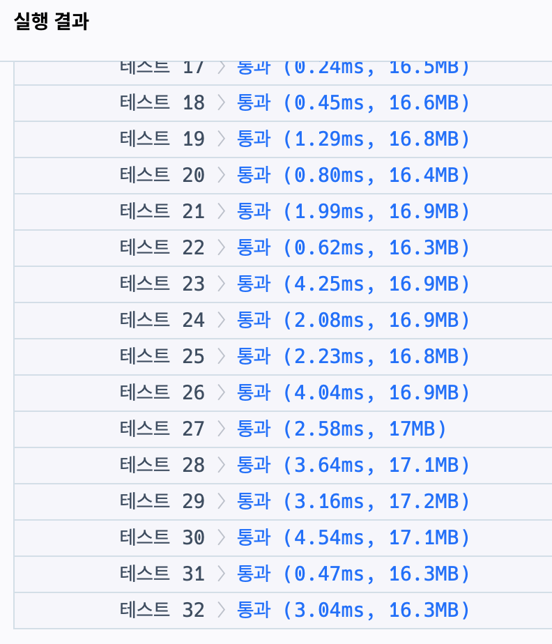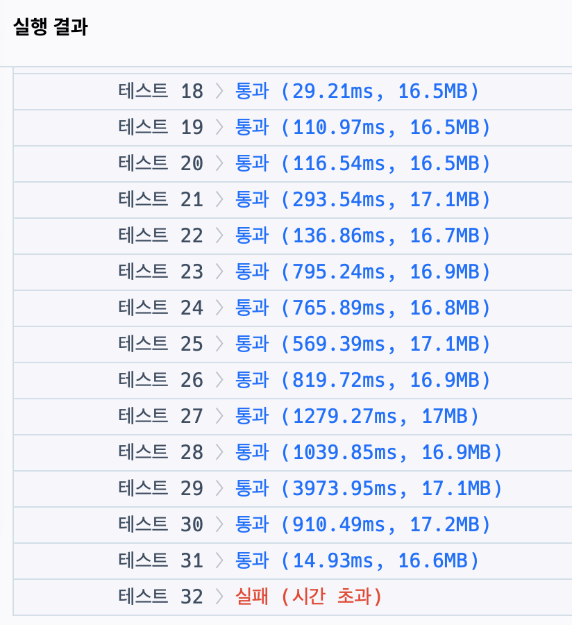 실행 결과 테스트 1~11까지는 0.1ms 도 안걸릴 정도로 짧았지만, 문제는 테스트케이스 32번이 시간 초과가 되었다.