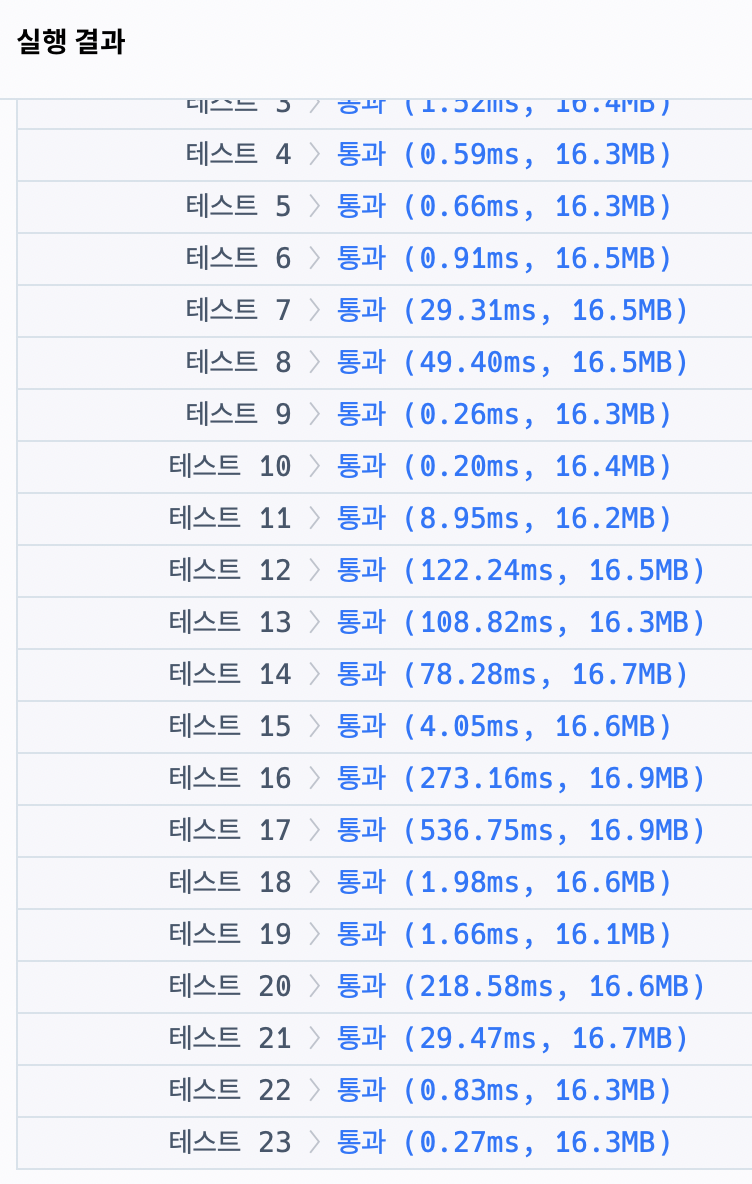 모든 테스트에서 좋은 실행결과가 나왔다. 테스트 19의 경우 528.29ms에서 1.66ms로 속도도 엄청 개선되었다.