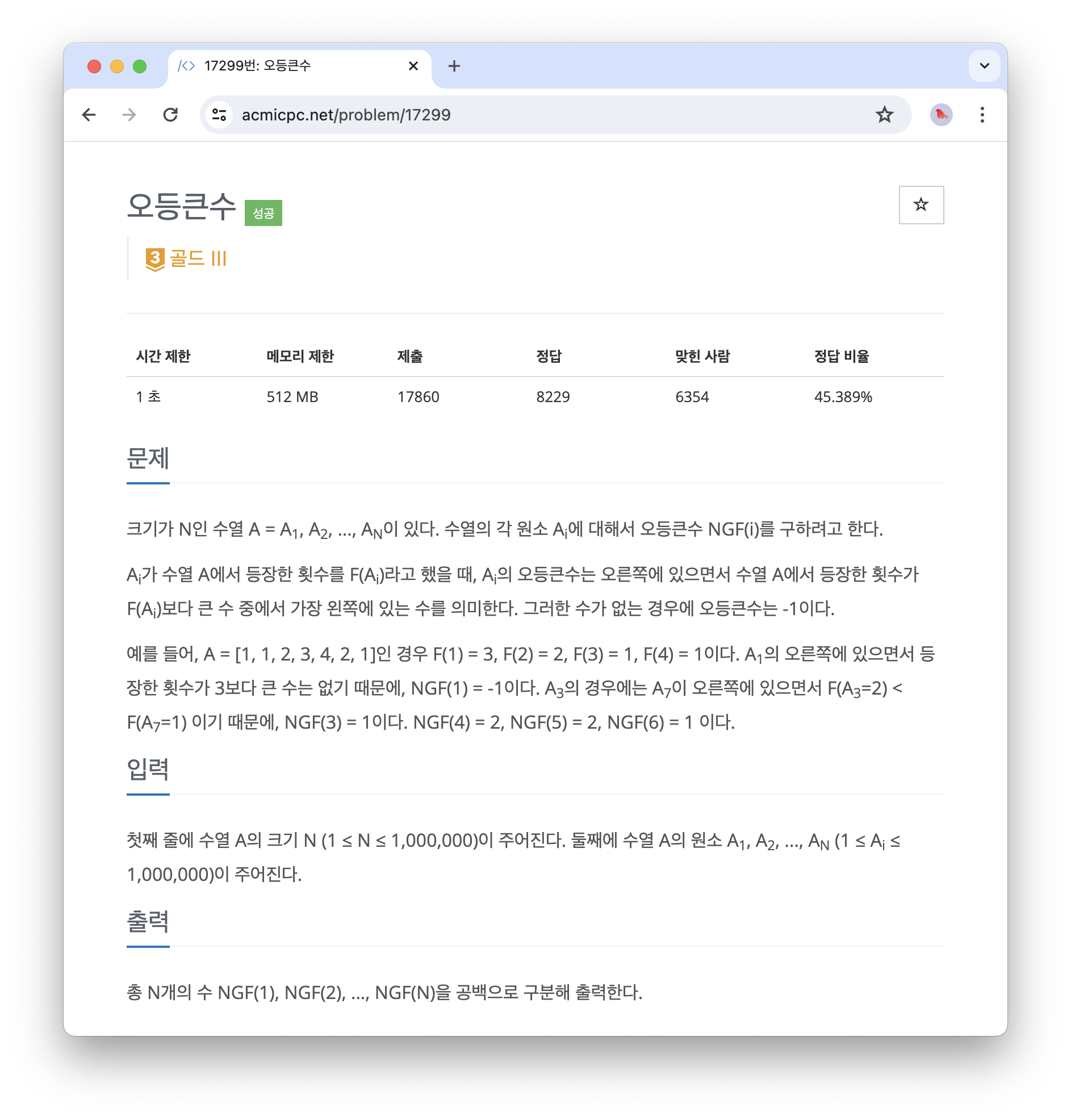 Ai가 수열 A에서 등장한 횟수를 F(Ai)라고 했을 때, Ai의 오등큰수는 오른쪽에 있으면서 수열 A에서 등장한 횟수가 F(Ai)보다 큰 수 중에서 가장 왼쪽에 있는 수를 의미한다. 그러한 수가 없는 경우에 오등큰수는 -1이다. 설명하기가 좀 복잡해서 아래 문제 캡처를 첨부한다.
