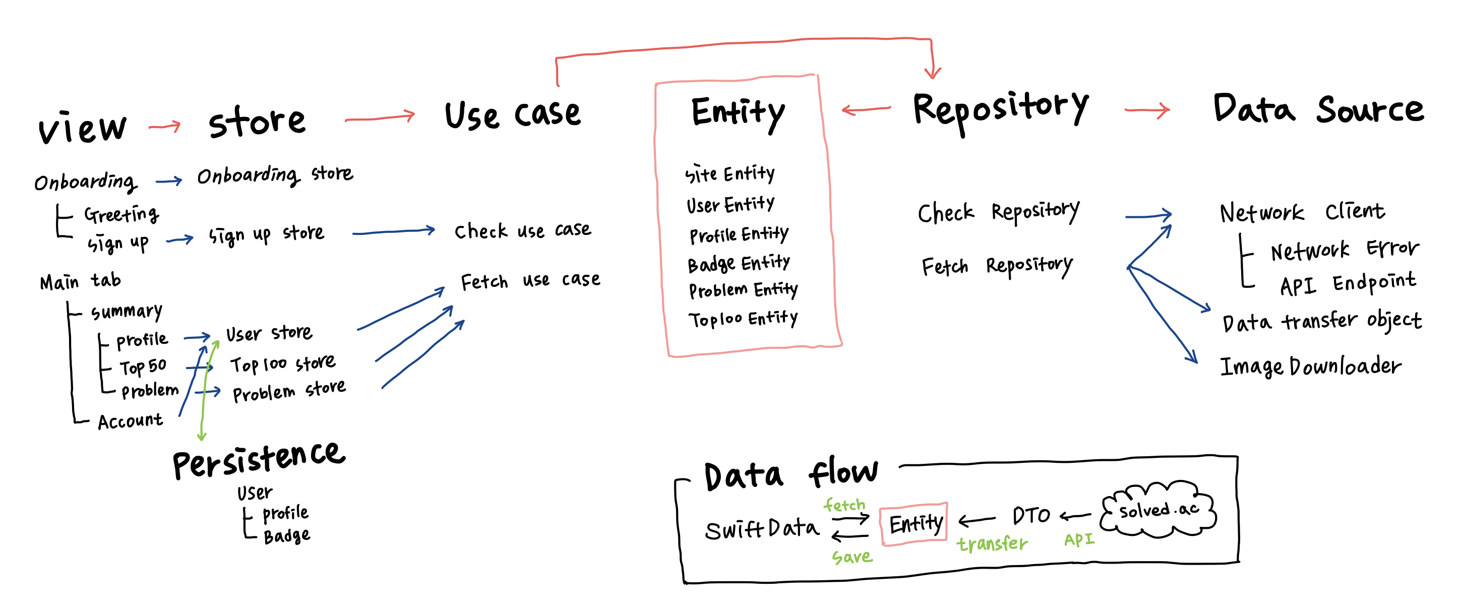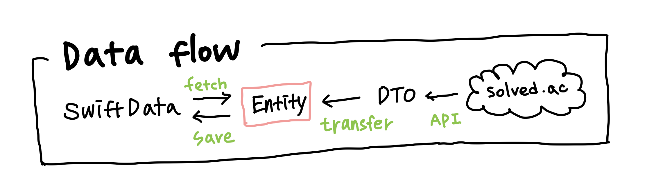 Data흐름의 경우 최대한 단방향으로 이루어지게 하였다. 데이터 흐름의 경우 Solved.ac에 저장되어있는 데이터를 API를 사용하여 호출하여 DTO로 바꾸어 준다. 바꾸어준 DTO를 입맛에 맞게 Entity로 변경해 주었다. 그리고 이렇게 변환된 Entity를 앱에 표시한다.