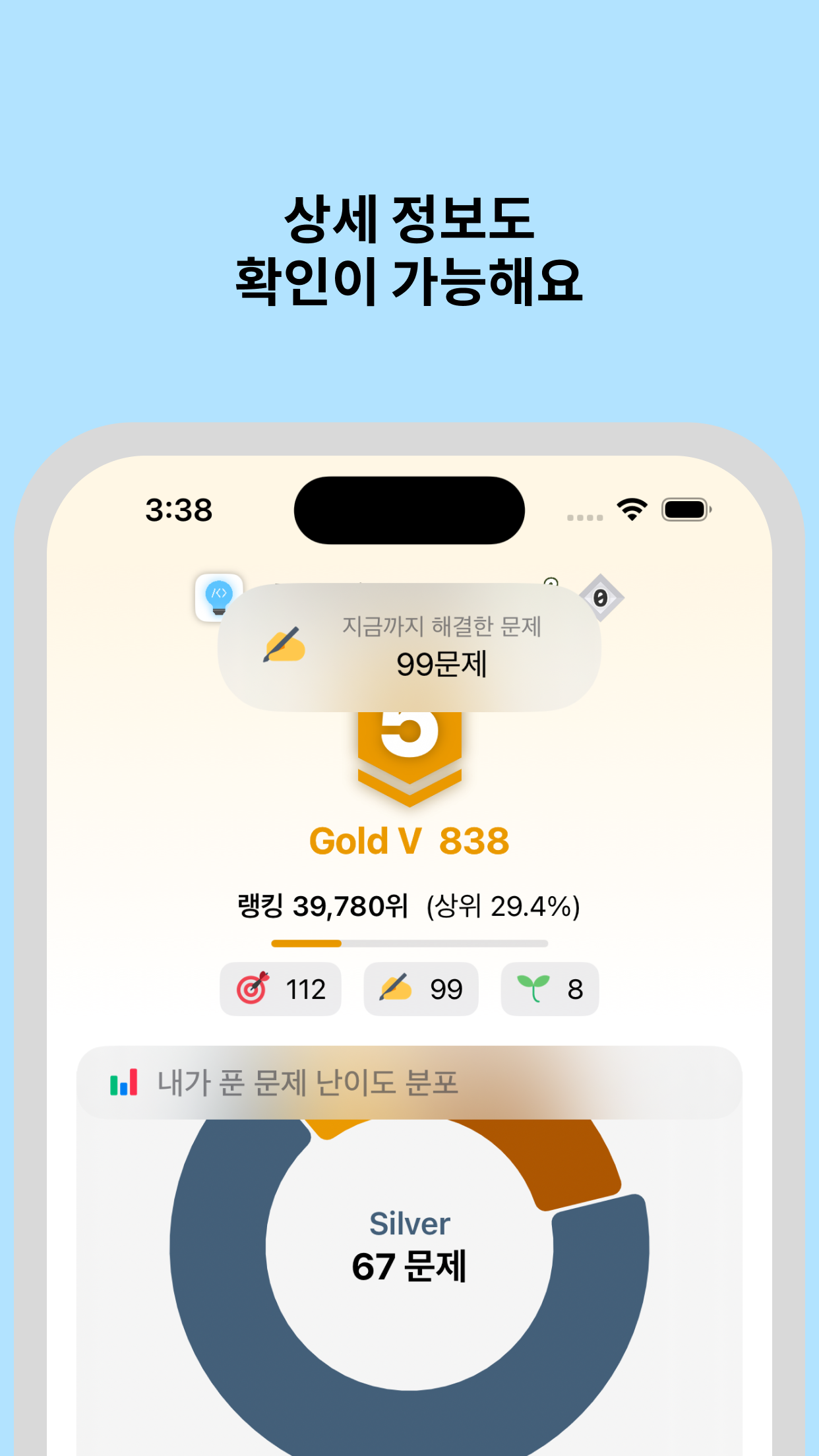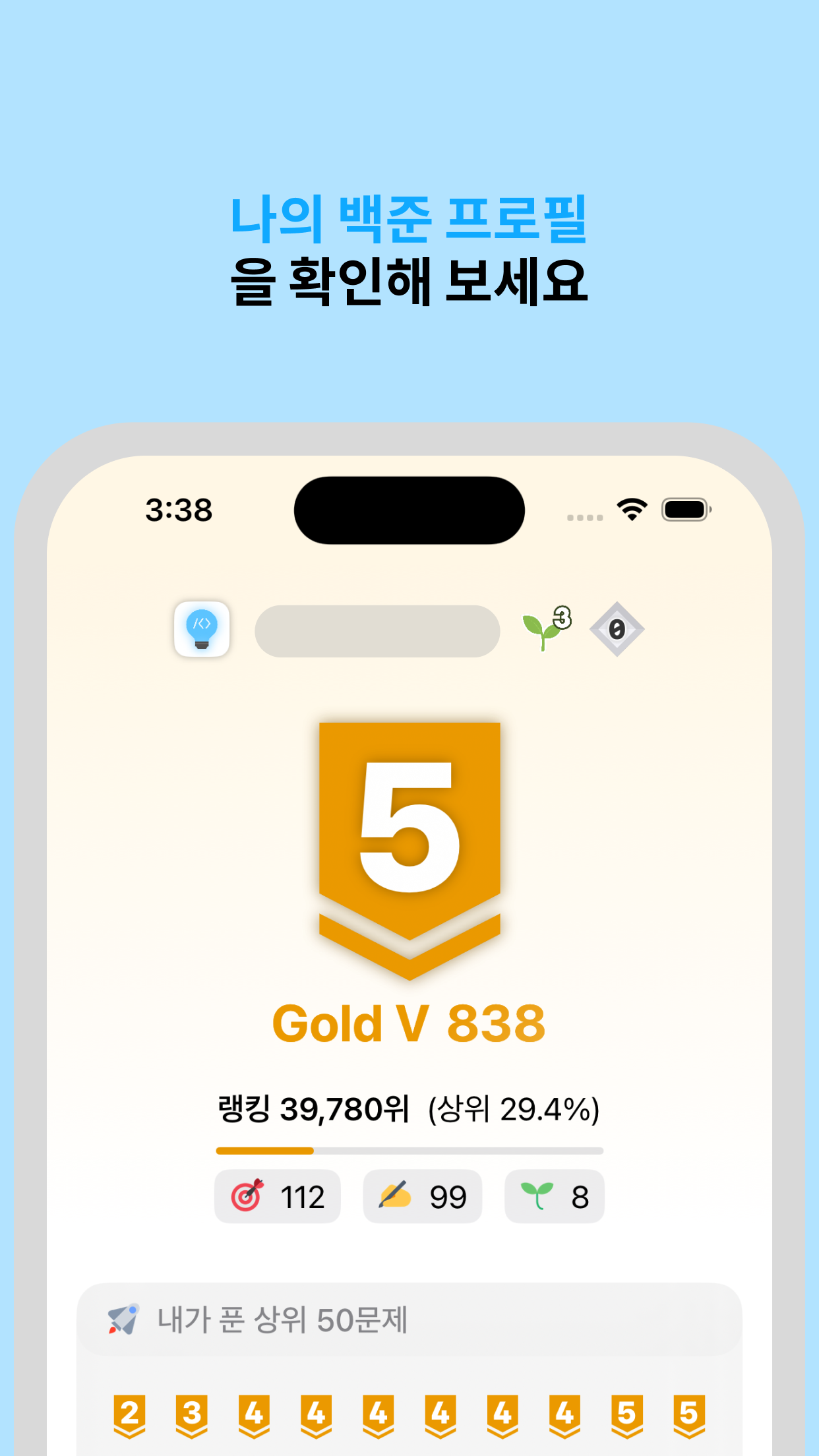 아래와 같이 아이디를 입력하게 되면 백준 프로필을 확인할 수 있다. 아래는 내가 푼 상위 50문제, 내가 푼 문제 난이도 분포를 그래프 형태로 볼 수 있다.