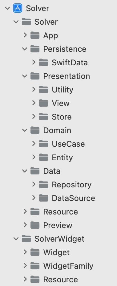 파일구조는 아래와 같다. 크게는 Solver앱, SolverWidget앱이 있다. Solver앱에서는 크게 Presentation, Domain, Data로 나누었다. persistence의 경우 SwiftData를 활용해 유저의 정보를 저장하고 Store에서만 사용하여 Entity로 바꿔주기 때문에 별개의 레이어로 두었다.