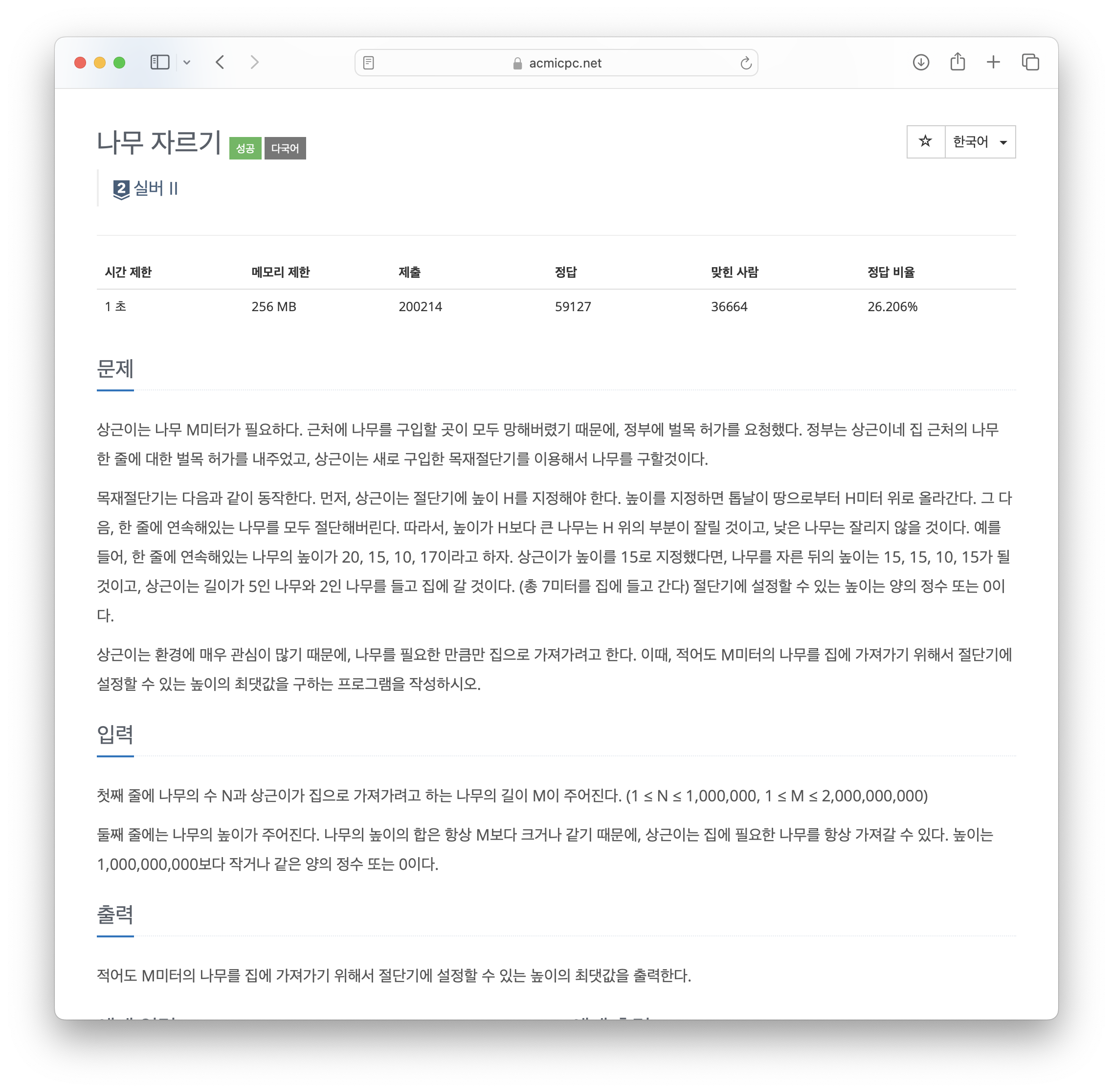 나무를 어떻게 잘라야 하는지 결정해야하는 이진탐색 문제이다.