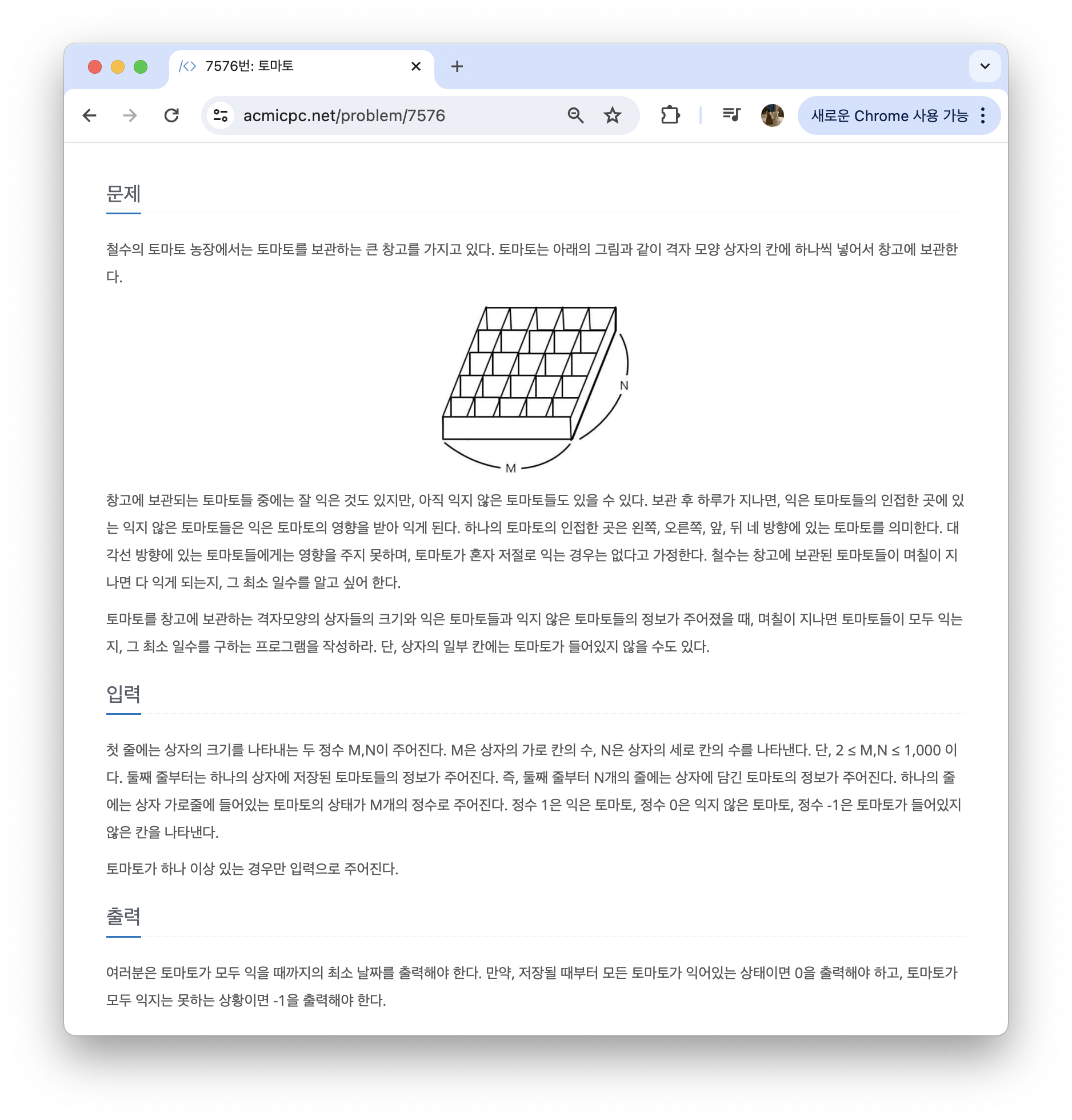 토마토가 다 익는 시간을 구하는 문제이다. 익은 토마토부터 번져나가는(?) 시간을 구하는 것이다.